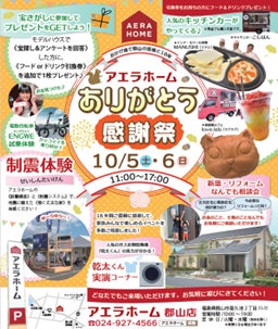 注文住宅・規格住宅の販売やリフォーム事業、フランチャイズチェーン事業(以下:FC事業)、不動産事業等を展開するアエラホーム株式会社 (以下:アエラホーム 東京都千代田区/代表取締役社長 中島秀行)は、郡山店(福島県郡山市)の18周年を記念して、2024年10月5日(土)、6日(日)に「ありがとう感謝祭」を開催いたします。