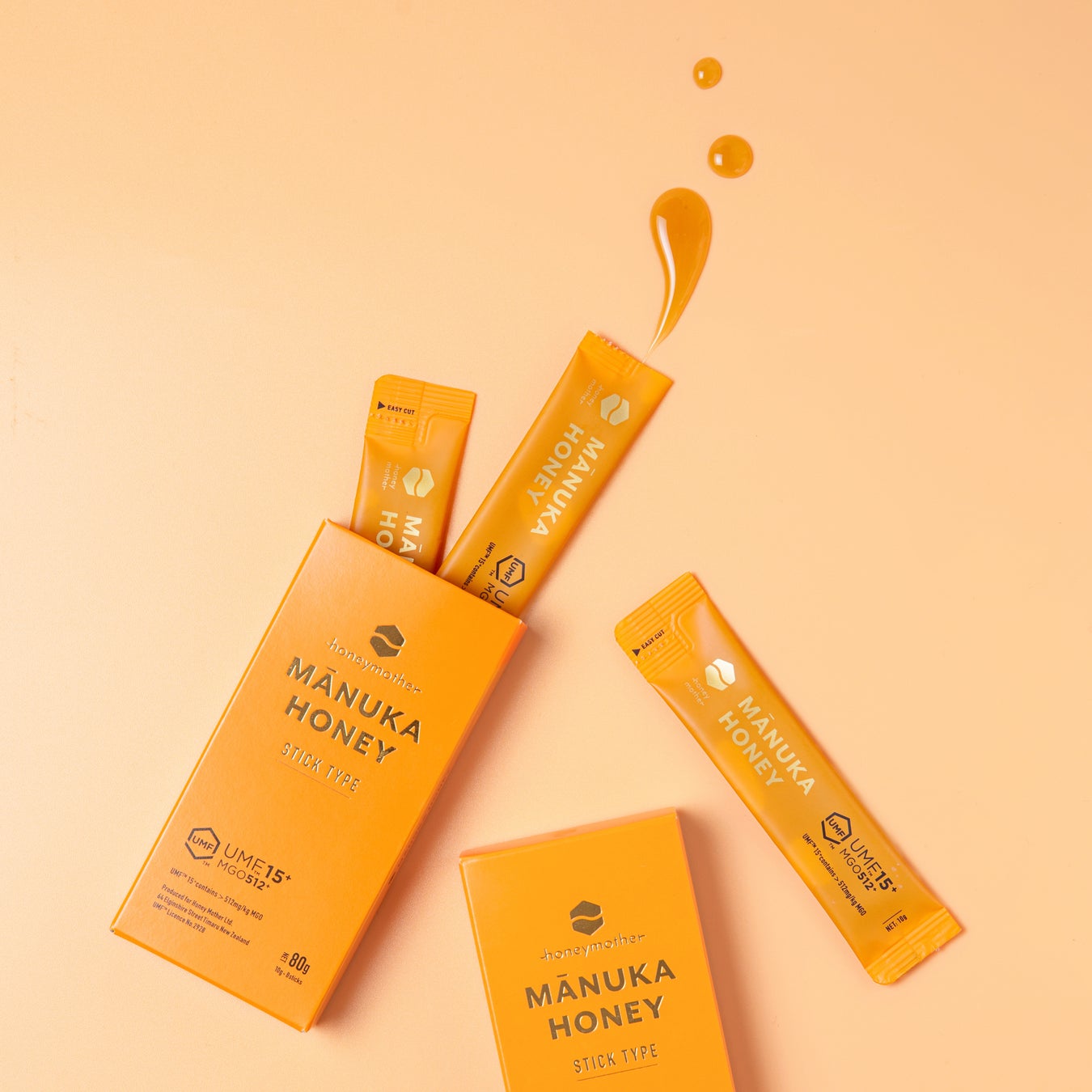 これまでUMF10+(*1)のみだったスティックマヌカハニーに、平素からハニーマザーで人気を集めている3グレードが加わってラインナップ拡充。ご自宅でのご利用はもちろん、お出かけや通勤のバッグにしのばせておけば、ちょっとエネルギーチャージしたい時や、のどをいたわりたい時などにいつでもサッと使えて便利です。