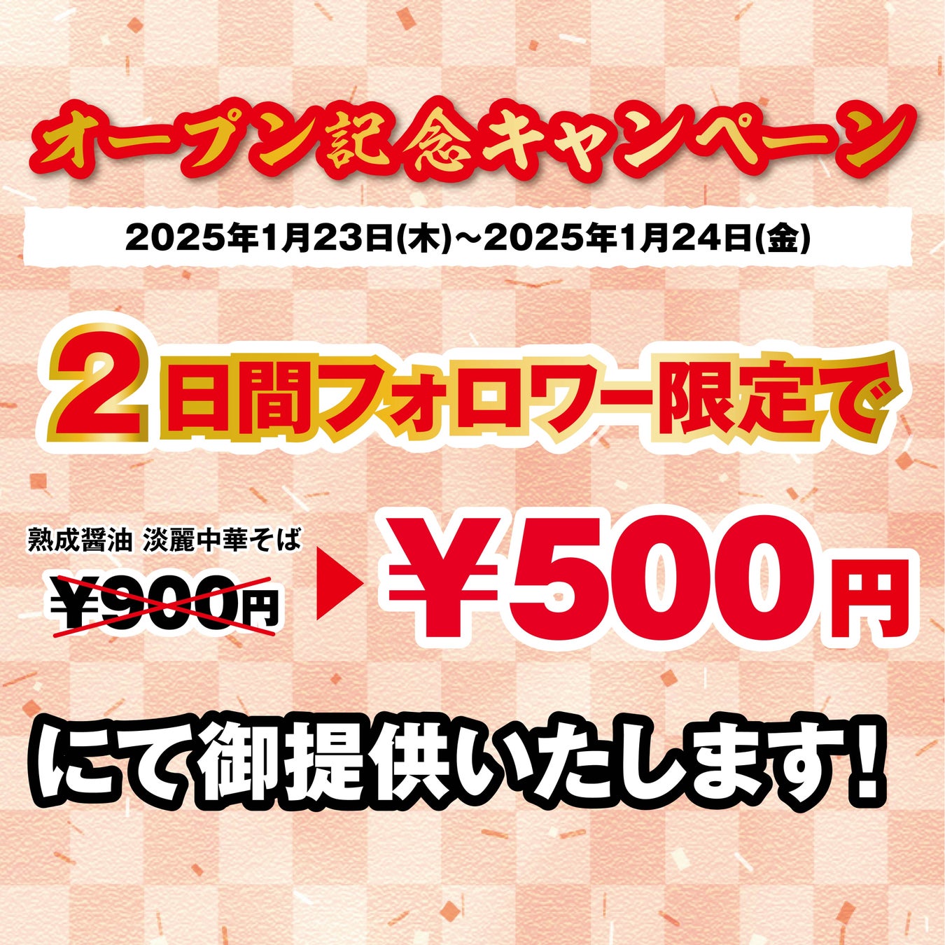 ①Instagram公式アカウントをフォローした方限定で、2025年1月23日(木)~2025年1月24日(金)の2日間で「熟成醤油 淡麗中華そば(¥900)」をワンコイン500円でプレゼント!
