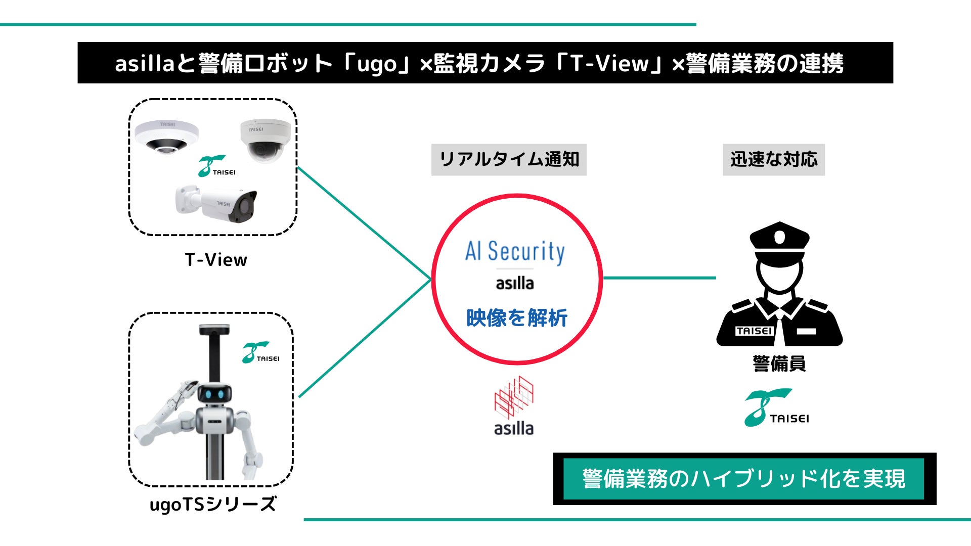 大成株式会社(本社:名古屋市中区栄、代表取締役社長:加藤 憲博 以下、「大成」)は、株式会社アジラ(本社:東京都町田市 代表取締役CEO 兼 COO 尾上剛 以下、「アジラ」)とAI警備DX「AI Security asilla(以下、asilla)」に関する事業提携を結んだことをお知らせいたします。