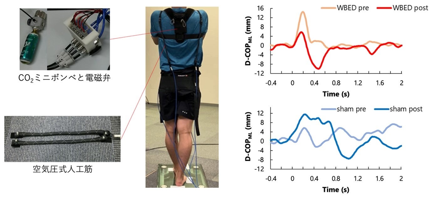左図. 本研究で開発した反応性姿勢制御のためのウェアラブル・バランストレーニング装置(WBED; Wearable Balance Exercise Devise)。空気圧式人工筋(PAM; Pneumatic Artificial Muscles)により微細な外乱を発生させ、ユーザーはその外乱に抗して姿勢を保持することで反応的姿勢制御、つまり何かに刺激に対して反射的にバランスをとる能力を改善する。