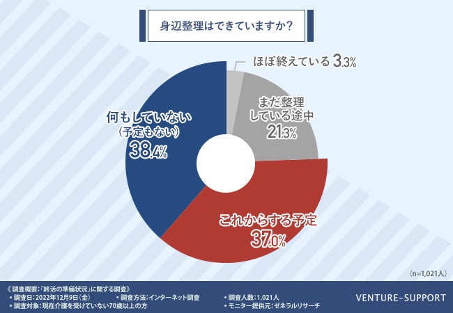 「身辺整理はできていますか?」と質問したところ、「何もしていない(予定もない)(38.4%)」と回答した人が最も多く、次いで「これからする予定(37.0%)」となった。