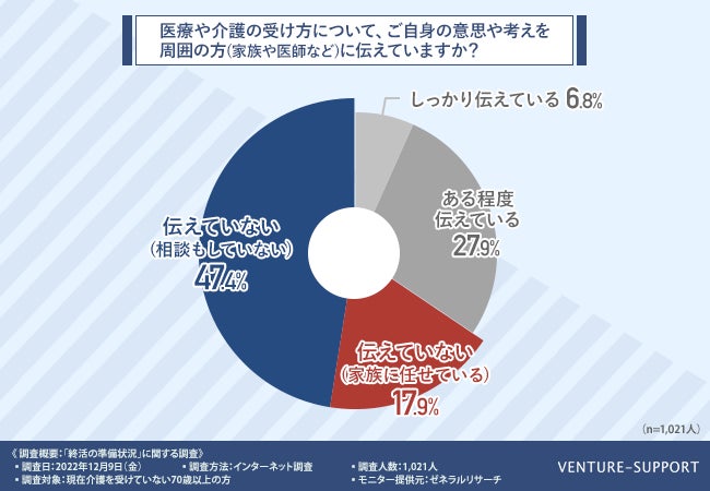 結果、「伝えていない(相談もしていない)(47.4%)」「伝えていない(家族に任せている)(17.9%)」と回答した人は6割以上にのぼった。