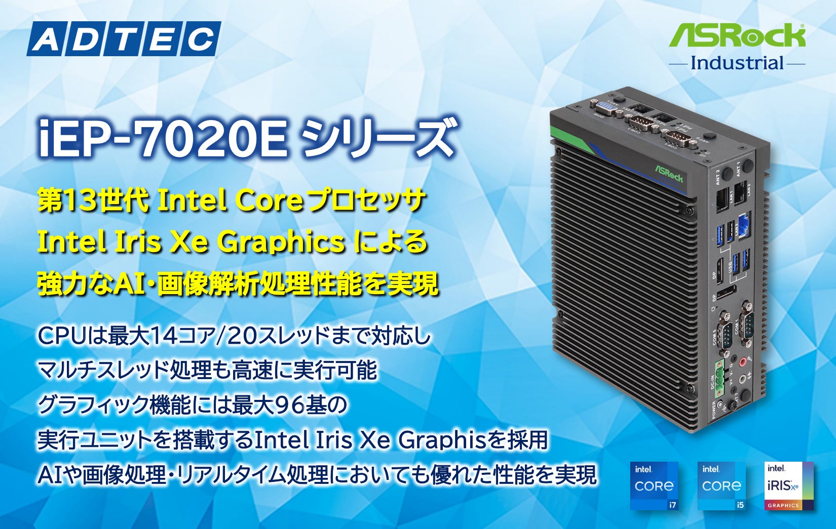 今回発売する新製品「iEP-7020Eシリーズ」は、第13世代 Intel® Core™ プロセッサ(Raptor Lake-P)とIntel® Iris® Xe Graphicsによる強力なAI・画像処理性能を実装した産業用エッジコンピュータとなります。