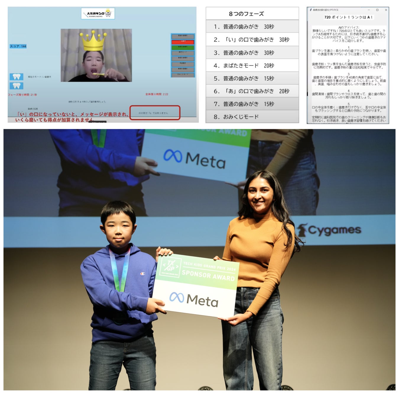 作品概要:歯磨きを楽しく習慣化するためのアプリ。AIカメラが指の関節の動きを認識し、磨き方を得点化。さらに、磨き方の精度に応じてランク付けを行い、楽しみながら正しい歯磨きを身につけることができる。