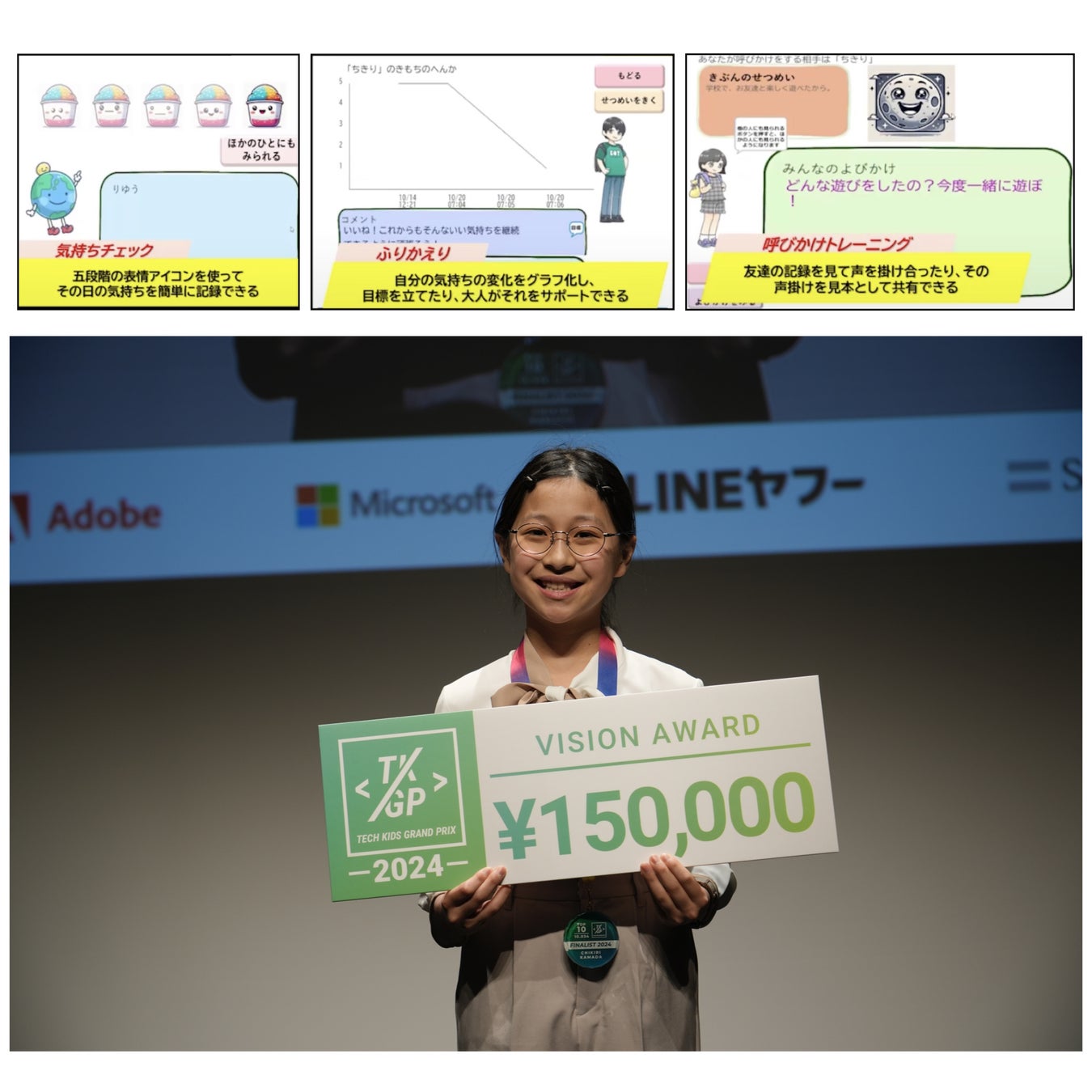 作品概要:子どものメンタルの変化を大人が素早く察知し、適切にサポートできるアプリ。子どもは5段階の表情アイコンを使って気持ちを記録し、他の子どもとコメントを通じて交流できる。大人は気持ちの変化を観察し、声かけの参考にすることで、より良い支援を行うことが可能。
