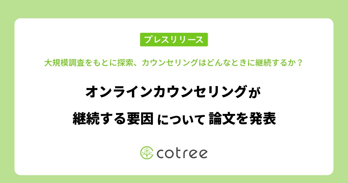 オンラインカウンセリング・コーチングの「cotree」を展開する株式会社cotree(本社:東京都港区、代表取締役:西岡恵子、以下cotree)は、早稲田大学人間科学学術院の桂川泰典准教授を中心とした研究グループと「オンラインカウンセリングにおける初期ドロップアウト要因」に関する共同研究を行い、論文を発表しました。その結果、①初回カウンセリング終了時に「効果の予感」を感じるとカウンセリングが継続しやすくなること。②カウンセラーの臨床経験年数が長いとカウンセリングが継続しやすいこと。一方で、③カウンセラーの年齢や性別の違いは継続の有無に影響しないことが明らかになりました。なお、本研究の成果は日本パーソナリティ心理学会 学会誌『パーソナリティ研究』にて公開されています。