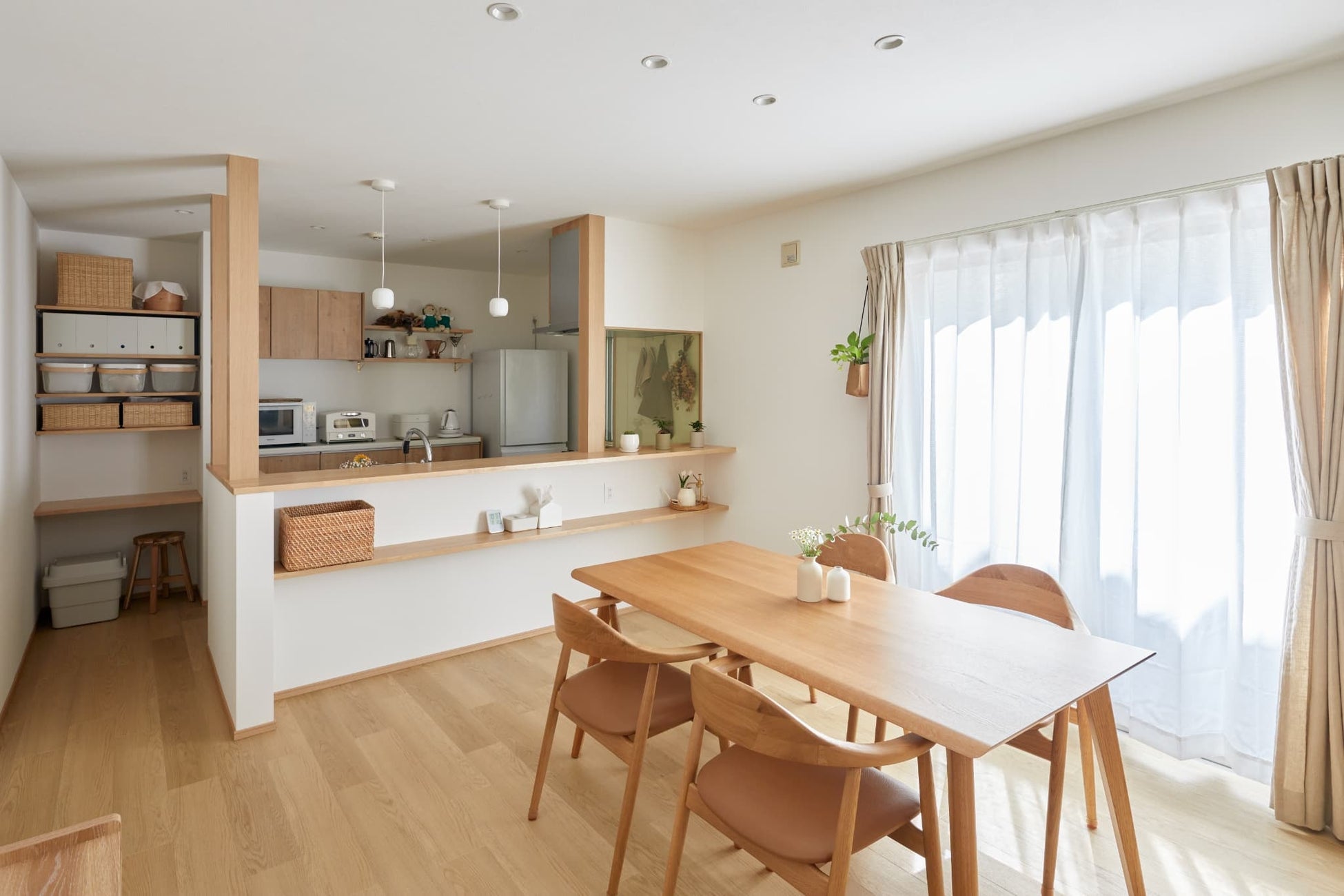 床材とカウンター、柱、キッチンを同系色でそろえた、ナチュラルな空間。部屋の雰囲気に合うように、オークの家具を提案しました。