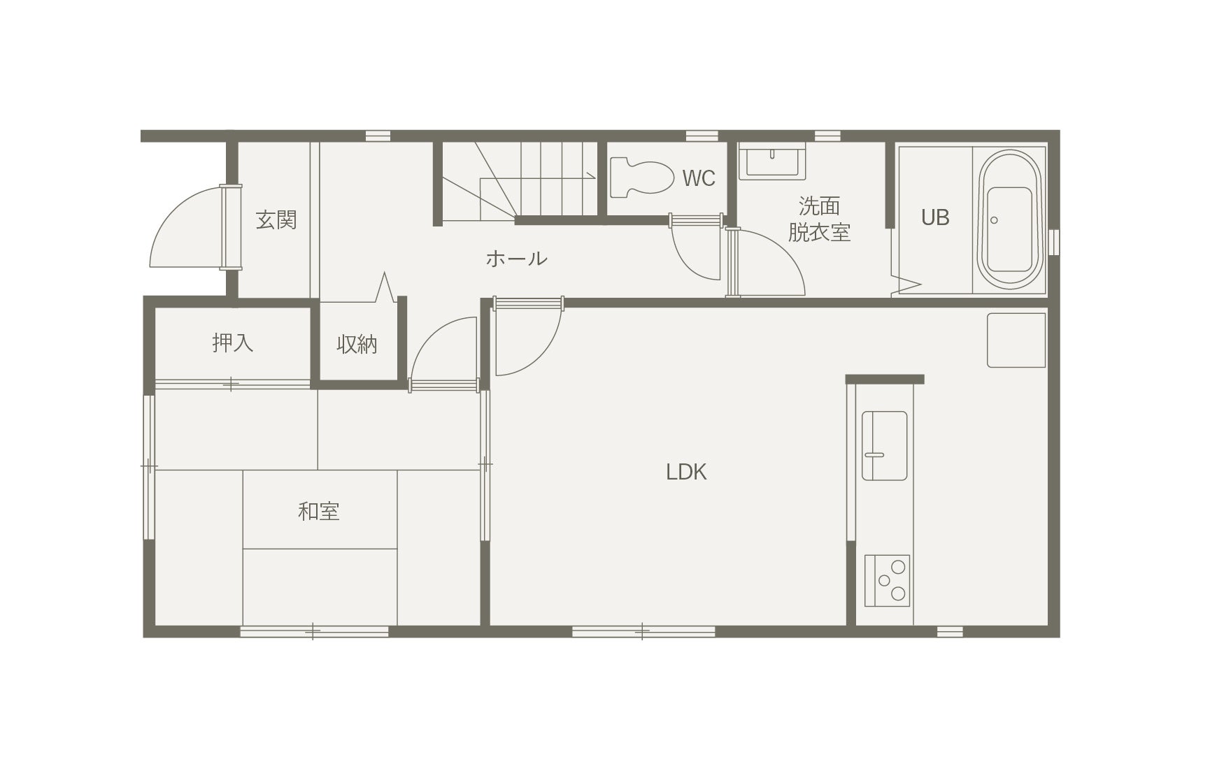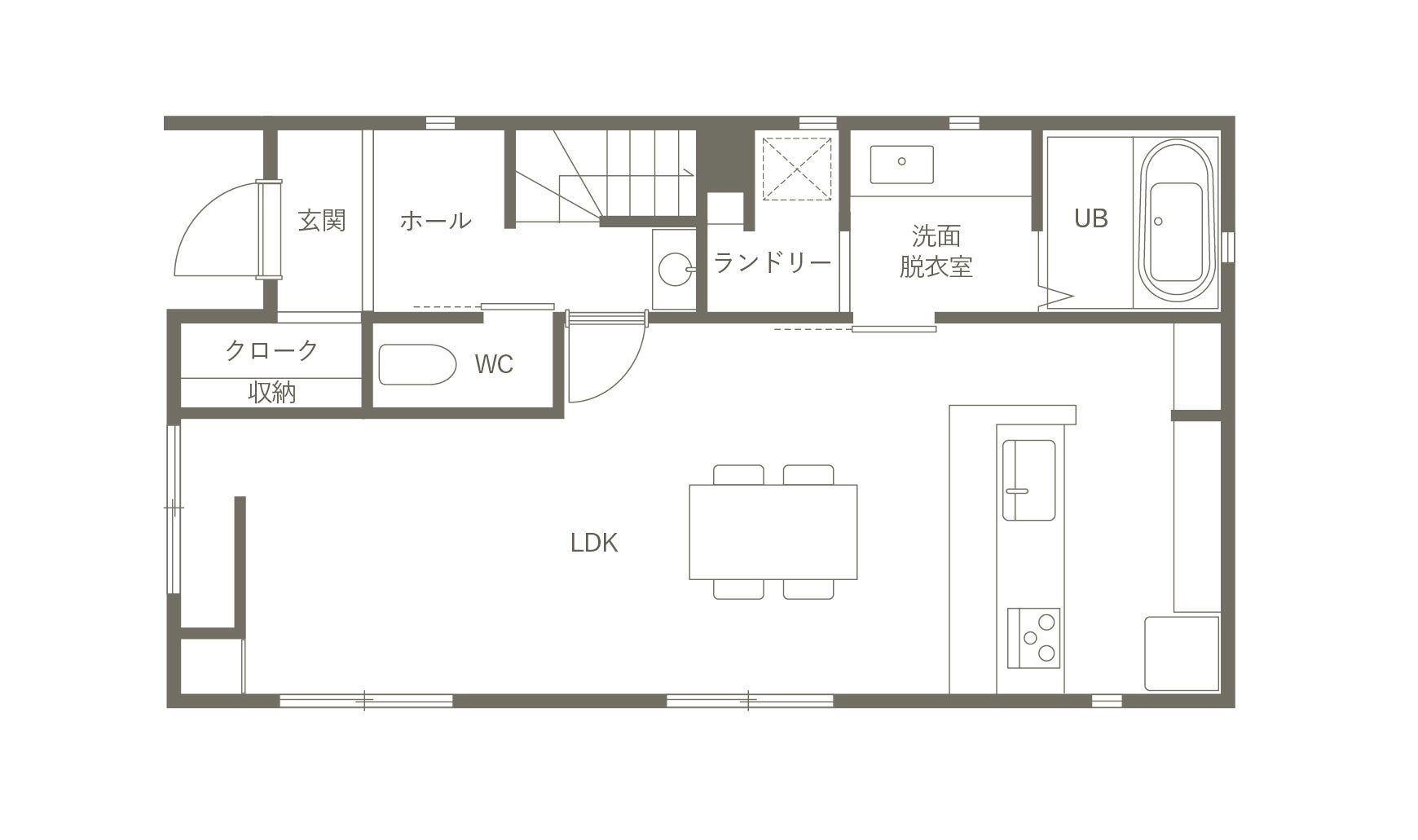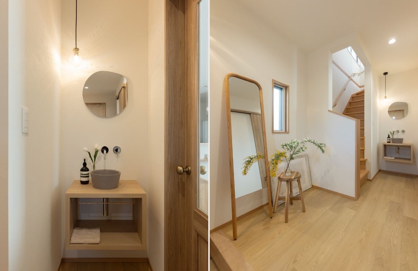 トイレの位置を玄関横へ移設し、手洗い場を廊下に設けることでトイレと玄関の手洗いを兼用できる計画に。わざわざ洗面室に行かなくても手を洗うことができ、来客時にも大活躍します。