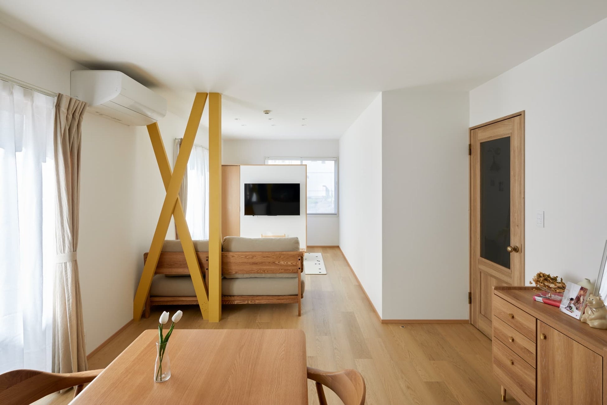 既存の和室をリビングに変えて、広々としたLDKを計画しました。建物の構造上、壊すことができない筋交いは現しにして抜け感を演出。筋交いを黄色で塗装し、家のシンボル的存在となりました。