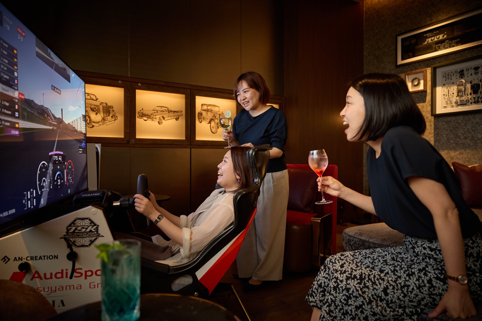 ホテル館内では、客室からのレース観戦や、モータースポーツを気軽に楽しめるアクティビティを通じて、その魅力を存分に体感していただけます。全120室のうち、サーキットビューの客室からはメインサーキットの約3分の1にあたるセクター3を一望。バルコニーに出れば、エンジン音とともに迫力のレースシーンが広がり、室内のテレビで実況を聞きながら、優雅な観戦を楽しむことができます。また、ジムにはプロ仕様のレーシングシミュレーターを完備。クルマごとに異なる振動やサウンドをリアルに再現し、時速250kmで富士スピードウェイを駆け抜けるレーサー気分を味わえます。さらに、BAR 4563の個室では、ドリンクを片手に「グランツーリスモ7」に挑戦可能。精緻なグラフィックとリアルなシミュレーションが、レース観戦前夜の高揚感を一層引き立てます。