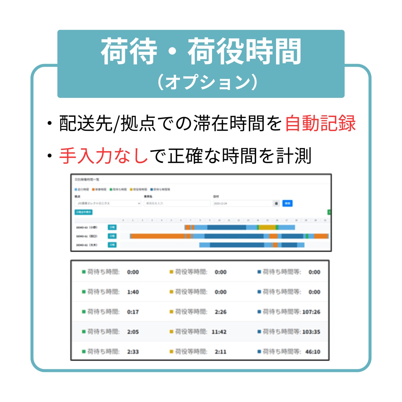 ・走行時間、走行距離、停車時間、荷待ち・荷役時間を自動集計
