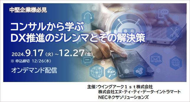 NECネクサソリューションズは、8月7日に開催しました「【中堅企業様必見】コンサルから学ぶ、DX推進のジレンマとその解決策」セミナーを好評につき、12月27日(金)までオンデマンド配信します。お申し込みは12月26日(木)まで受け付けています。