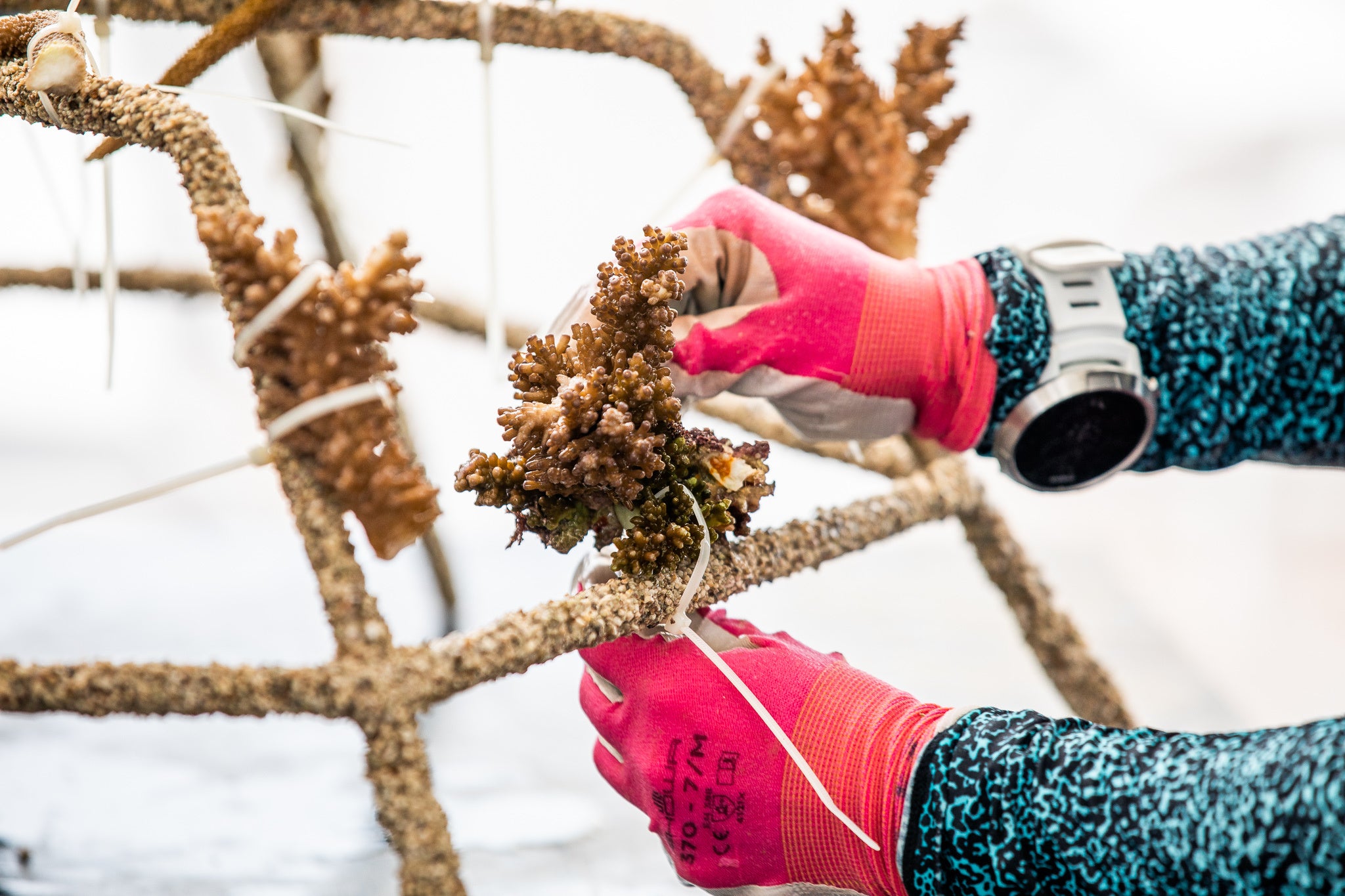 訓練を受け過去にも多くの実践を積んできた海洋生物学者や文化ガイドと一緒に、サンゴ礁の修復システムであるリーフ・スター※1 にサンゴの破片を結びつける体験をしながら、サンゴ礁の修復プロジェクトに参加することが可能です。