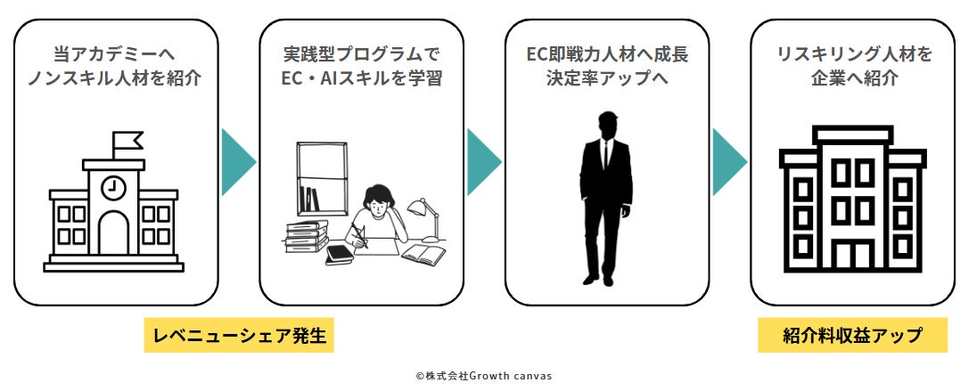 株式会社Growthcanvas(本社:福岡市、代表取締役:野邊祥一朗)は、人材紹介会社向けに「ECマーケター創出アカデミー」のレベニューシェア型提携プログラムを、2026年2月より開始いたします。本プログラムは、人材紹介会社が抱える「ノンスキル・塩漬け登録者」を、最短1ヶ月でEC即戦力人材へと育成し、レベニューシェアによる安定収益を創出する新たなモデルです。EC市場は継続的な成長を続ける一方で、実務経験を有する人材が慢性的に不足しており、多くの企業が採用難に直面しています。人材需要が極めて高い市場において、「決定困難な登録者」を「高付加価値人材」へと転換し、紹介料に依存しない収益構造の実現を目指します。