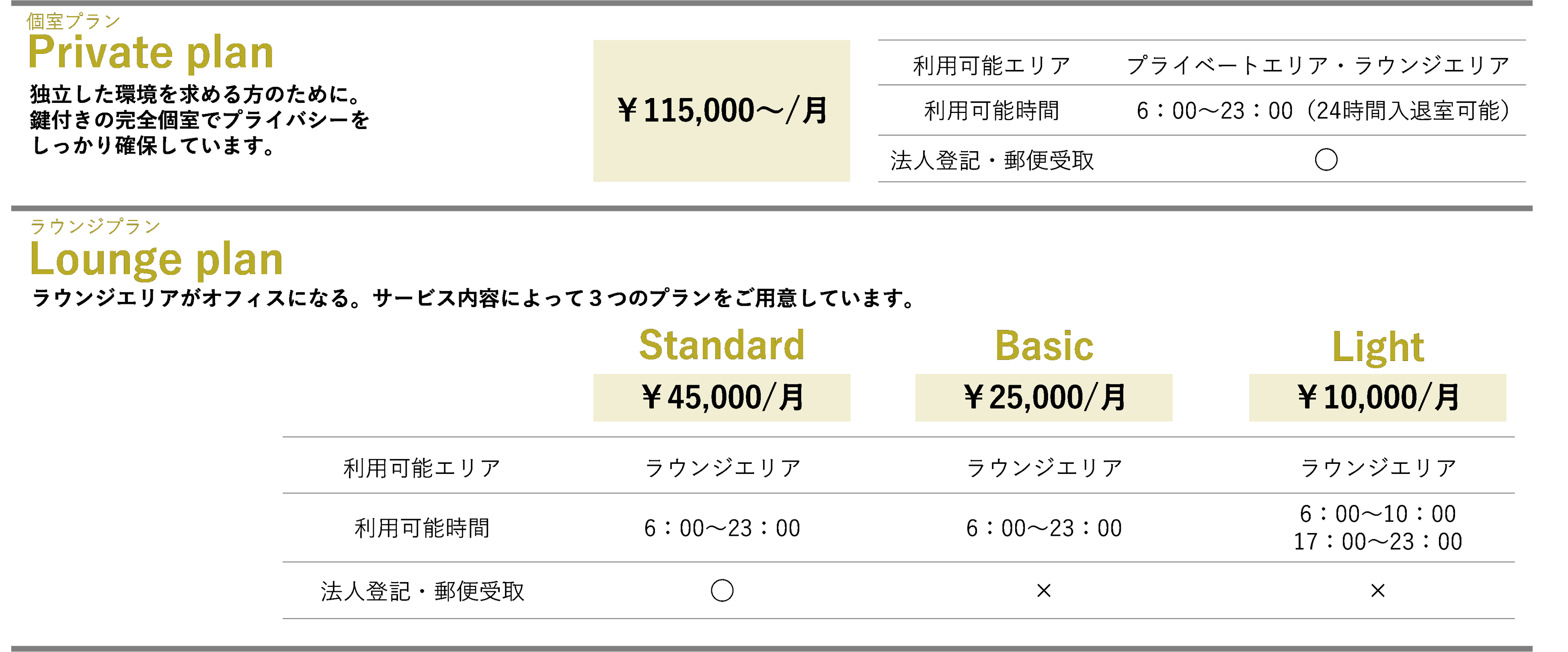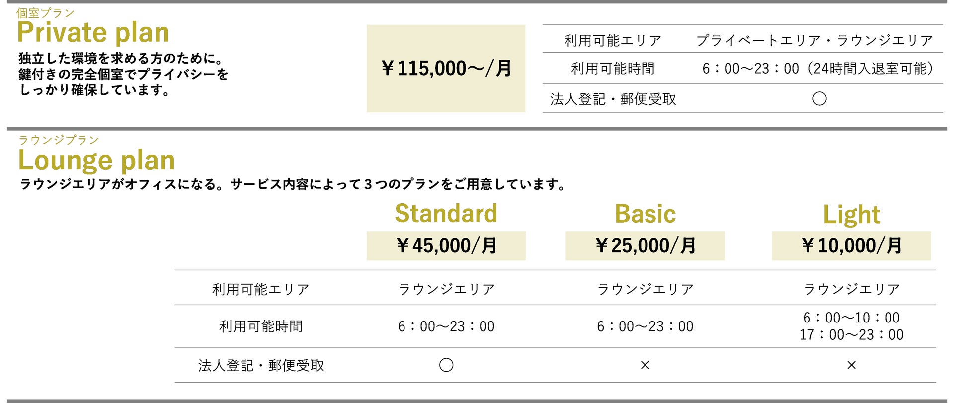 ワークスタイルにあわせ、完全個室の「プライベートプラン」(1名用~7名用)とフリーアドレスでラウンジエリアをご利用いただける「ラウンジプラン」をご用意。また、ご利用人数や時間、目的に応じて選べるバリエーションを設けています。