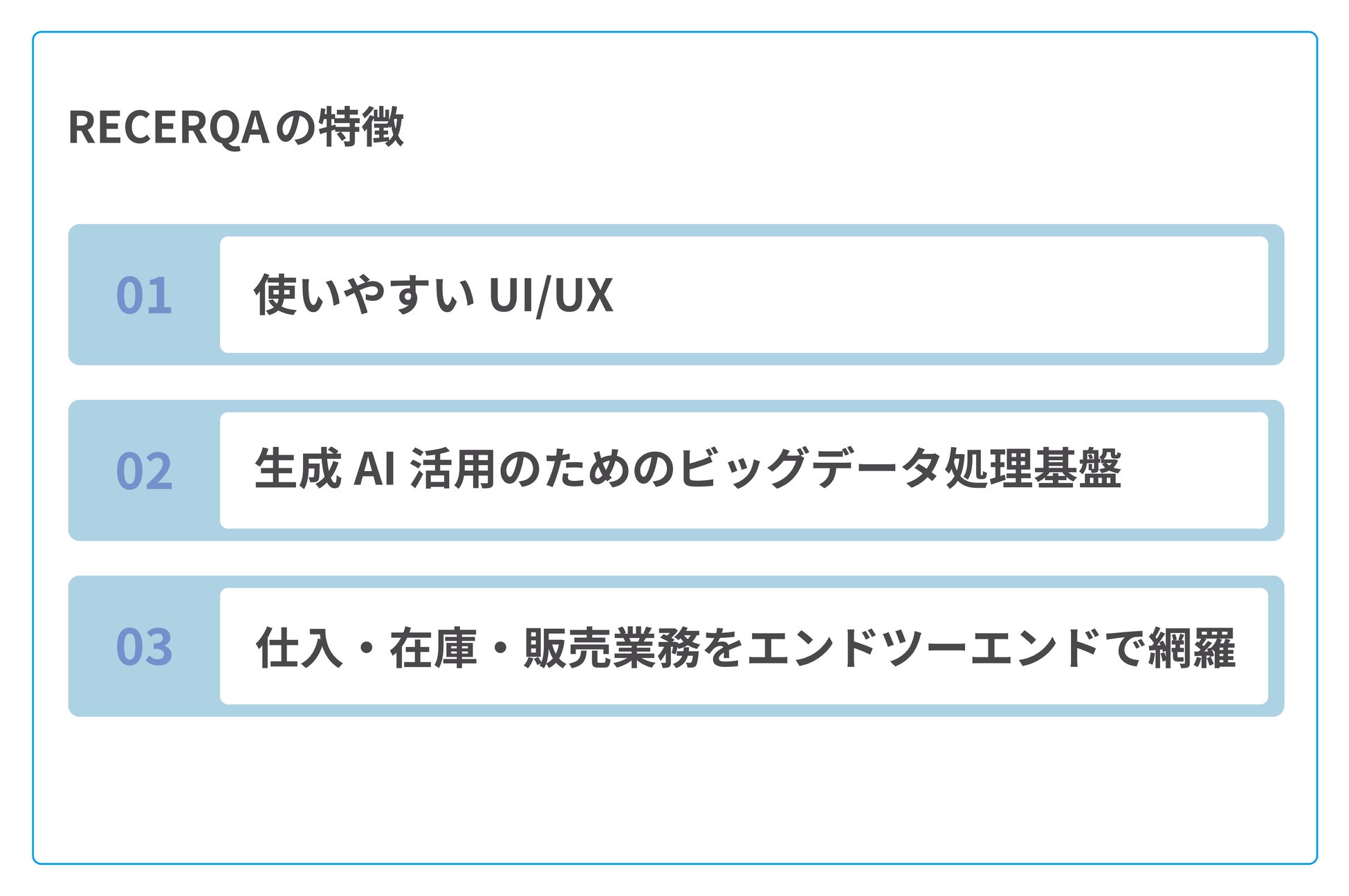 『RECERQA』は、そのような課題を以下の特徴によって解決しERP3.0(※)を実現するシステムです。