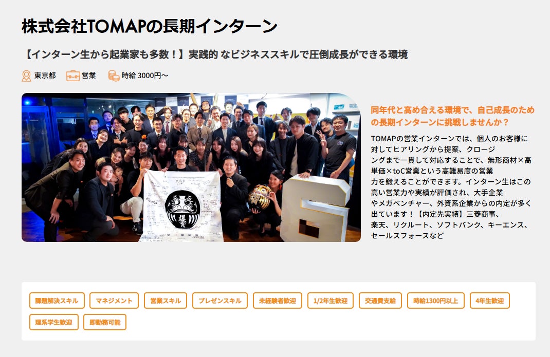 今回ご紹介する株式会社TOMAPの営業インターンは、まさにその想いに合致する場として注目しています。TOMAPは「すべての人に選択の自由を」というミッションを掲げ、教育事業を通じて「自らの意志で考え、行動できる人」を増やしていくことを目指しており、その取り組みが特に学生の成長に直結すると考えています。