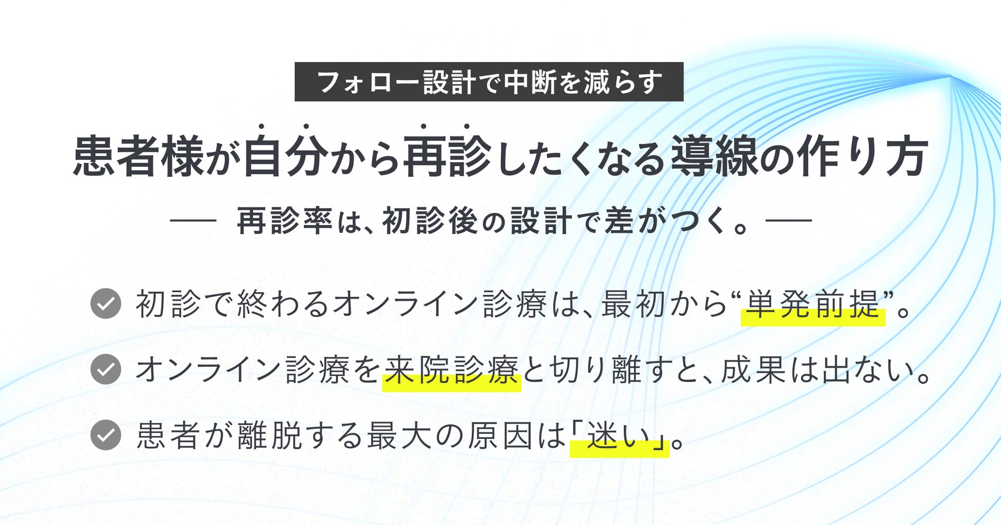 【オンライン/2026年4月23日(木)19:00】「〜フォロー設計で中断を減らす〜患者様が自分から再診したくなる導線の作り方」無料オンラインセミナー開催