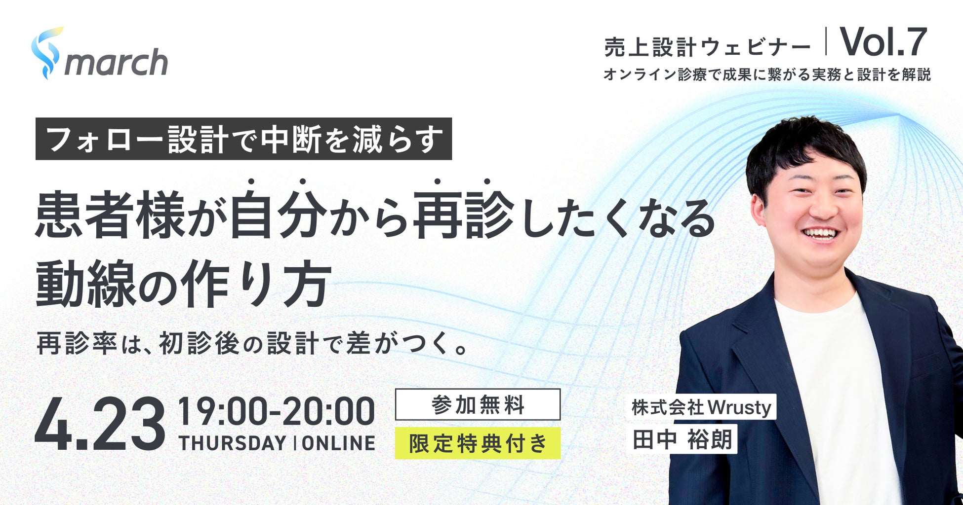 LINEを活用した集患と継続収益まで自動化することで、医療機関の “成果に責任を持つ” オンライン診療・集患オペレーションシステム「march」を展開する株式会社Wrusty(本社:東京都渋谷区、代表取締役:上田遼)は、全国の開業医・開業予定医の皆様を対象に、無料オンラインセミナー「〜フォロー設計で中断を減らす〜患者様が自分から再診したくなる導線の作り方」を2026年4月23日に開催いたします。本セミナーでは、中断を減らす診療後のフォロー設計を、成果に繋がっている医療機関の実例を交えて徹底解説します。また、なぜ「march」を活用している医療機関は1年間で9倍という収益に繋げることができているかを、再現性の高い設計という観点から解説します。