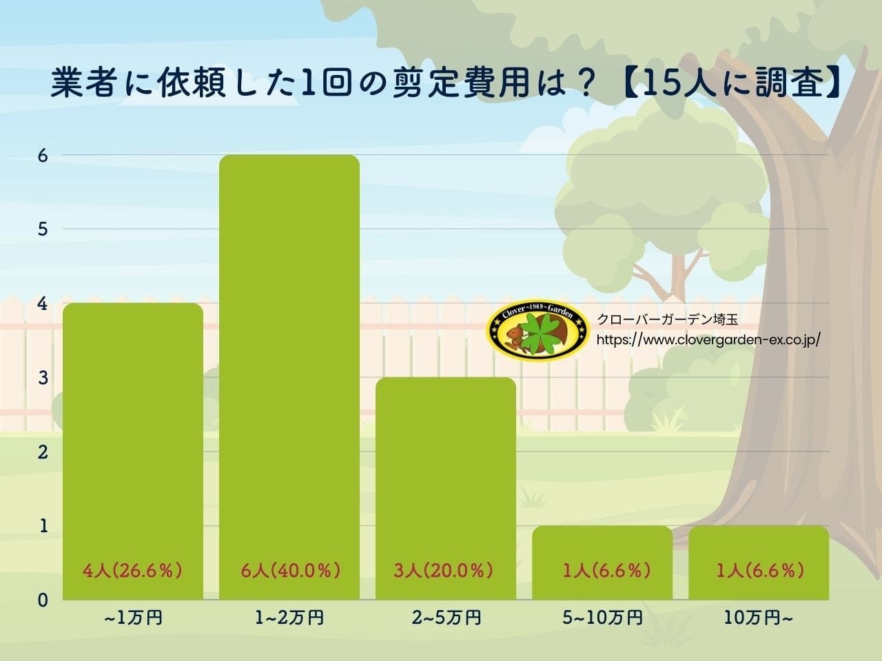 さらに、5万円から10万円、そして10万円以上を剪定費用として支払った人がそれぞれ1人(6.6%)いることも注目に値します。これらの高価格帯は、非常に大規模な庭園の管理や、特別な技術を要する剪定作業に対応していることを示しています。たとえば、高い技術を要する樹木の形状維持や、特殊な植物の扱いが含まれる可能性があります。
