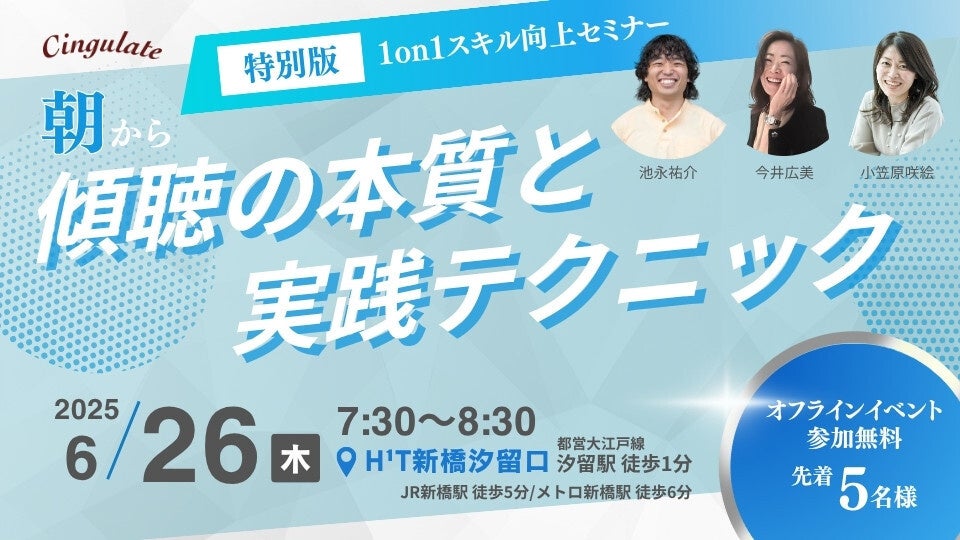 信頼の科学とデータサイエンスで組織開発を支援する株式会社シンギュレイト(本社:東京都渋谷区、代表取締役:鹿内 学、以下シンギュレイト)は、特別版1on1スキル向上セミナー「朝から傾聴の本質と実践テクニック」を2025年6月26日(木)7:30〜8:30で開催します。過去5回の開催回はすぐに枠が満席になり、参加者全員から「よかった」と評価をいただいている大好評の1on1セミナーをはじめてのオフライン開催です。