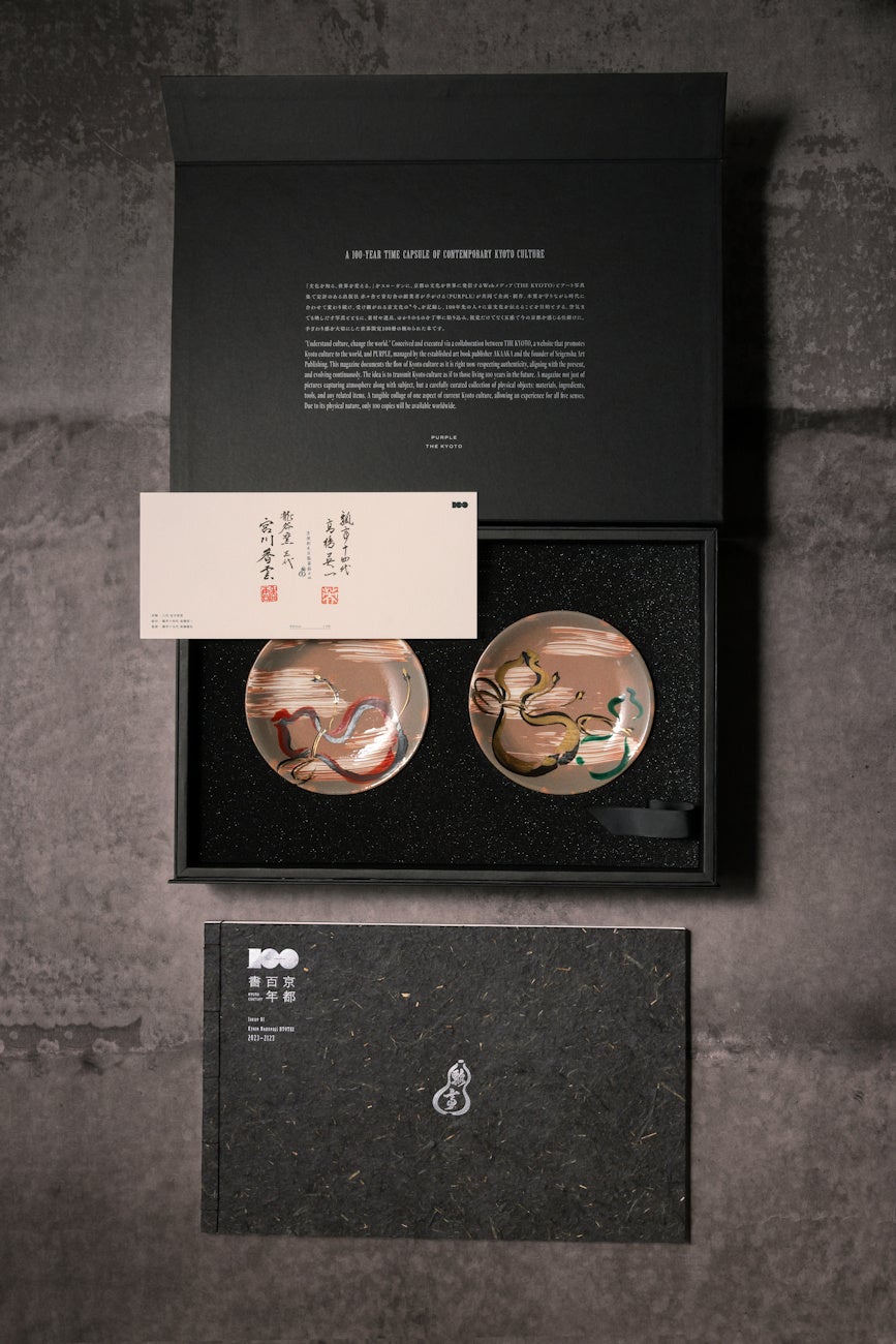 京焼・茶の湯道具を3代にわたって手がける龍谷窯 宮川香雲氏が作陶した皿に、瓢亭14代当主の髙橋英一氏が瓢箪の図柄を絵付けした限定品を特別に製作。二人の直筆サインと落款も添えた、『京都百年書』でしか手に入らない銘々皿2客と共にお届けします。