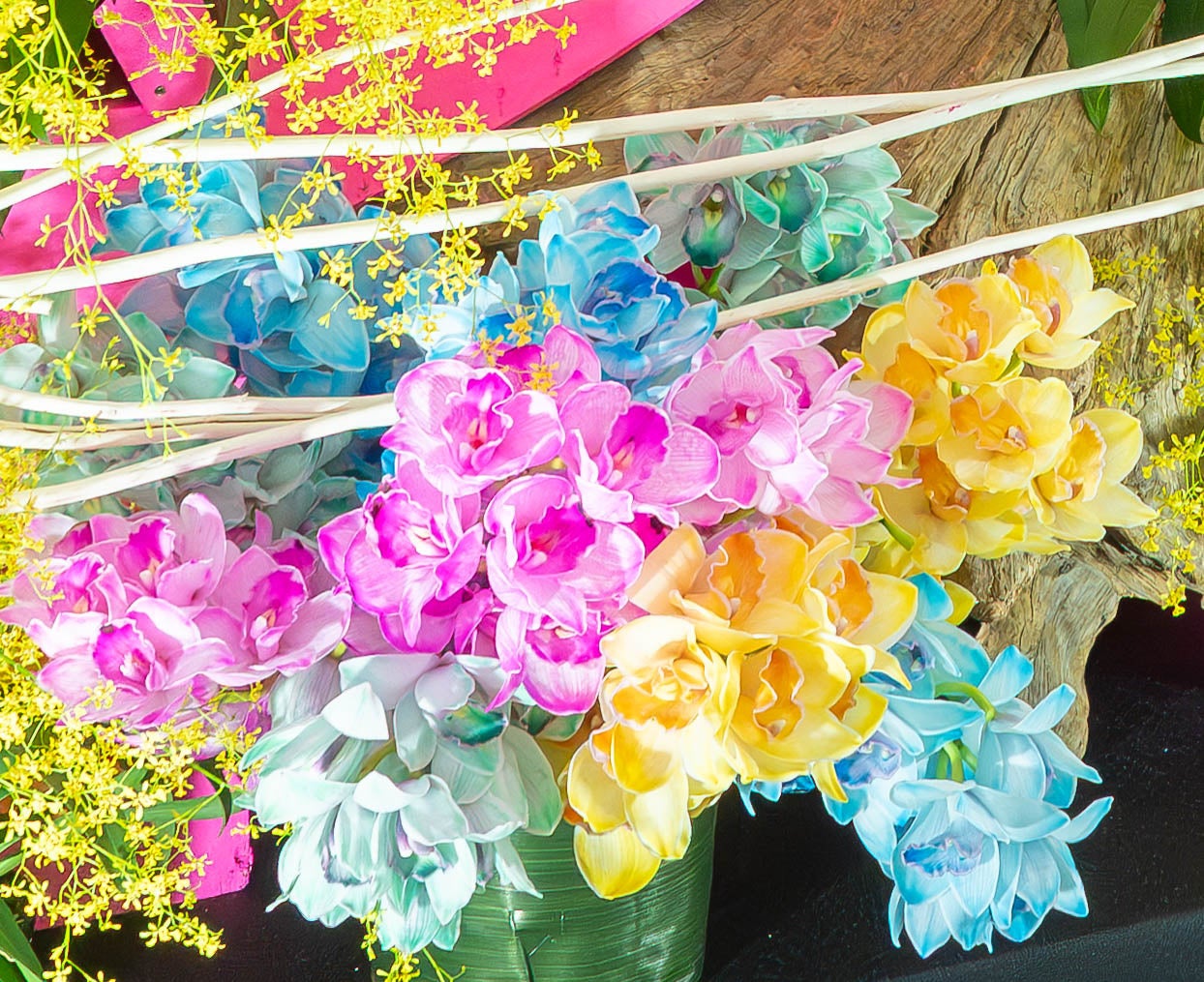 世界らん展での恒例となった本取り組みにおいて、今年も假屋崎氏が手掛けるシンボリックな大作に、弊社が提供した鮮やかな「染色シンビジウム(切り花)」が採用され、会場に圧倒的な華やぎを添えました。