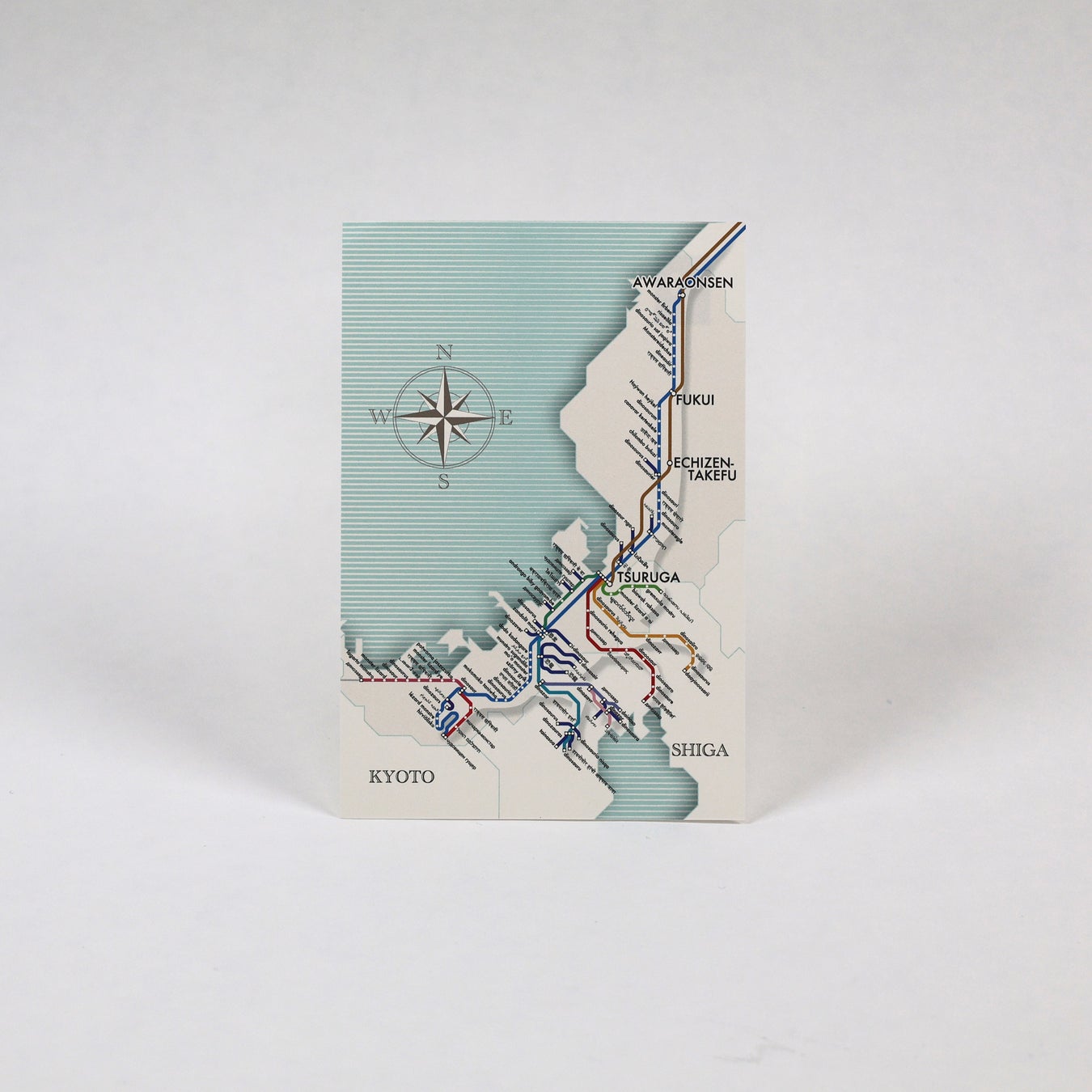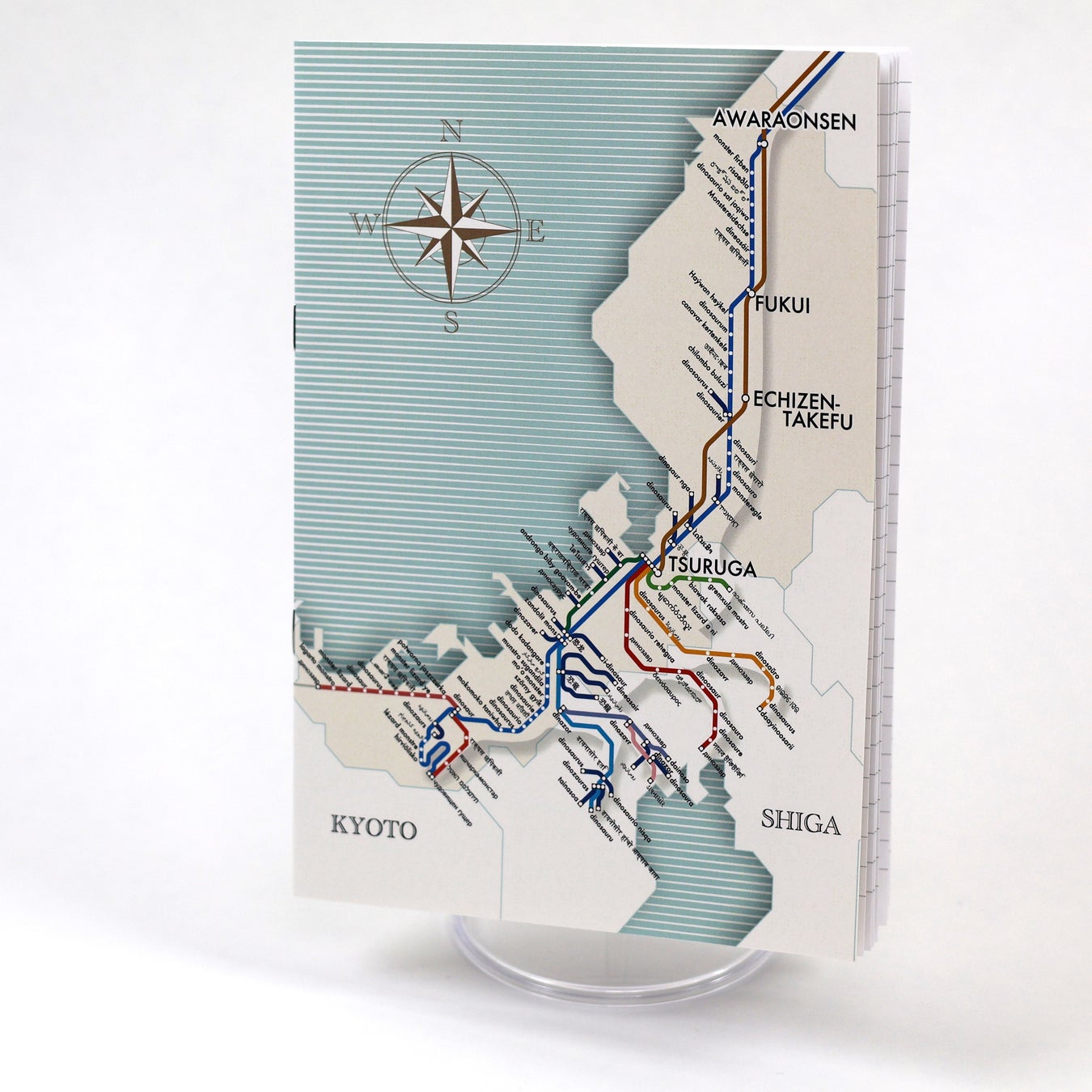 よ~く見ると恐竜のシルエットが浮かび上がる、路線図×アートをテーマにしたクリアファイルです。イラストには福井県の新幹線停車駅の駅名と、様々な言語で「恐竜」をあらわす言葉が駅名風に描かれています。