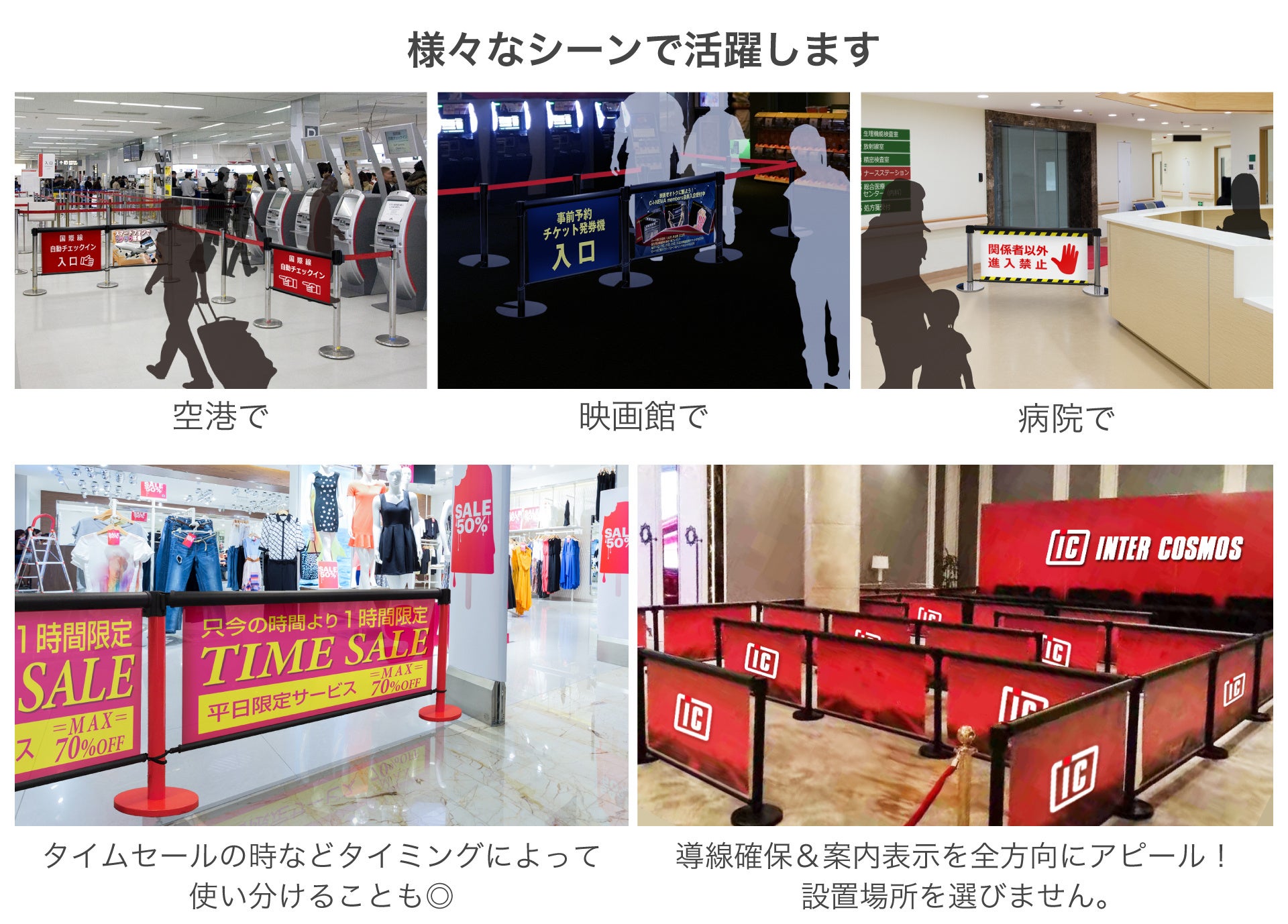 【パーテーションスクリーン】とは既存のベルトパーテーションポールに取り付けるだけでベルトパーテーション間のデットスペースが告知スペースとして活用出来る、広告と案内表示を兼ね備えた画期的なディスプレイです。