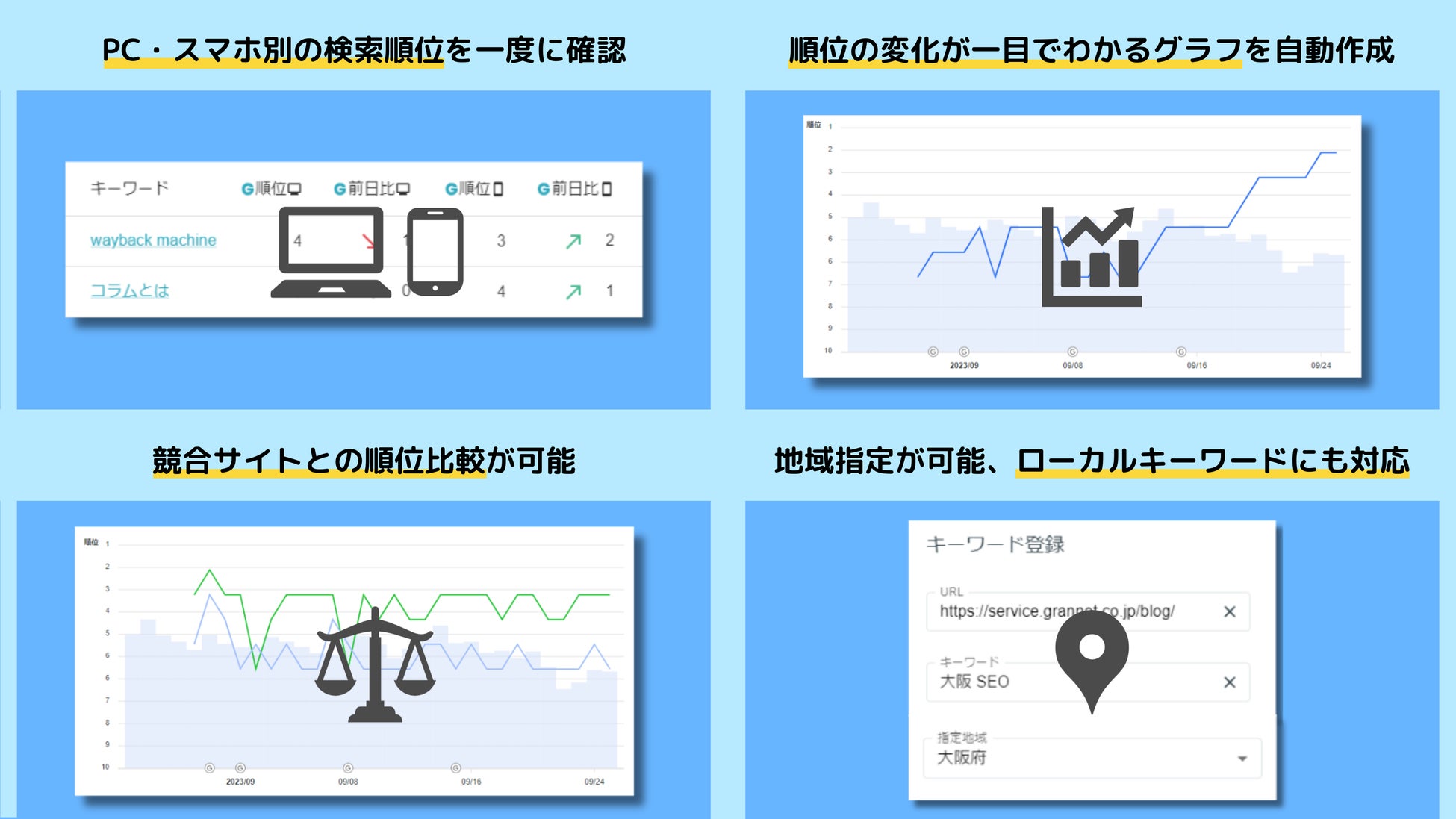 Google・Yahooのいずれにも対応。競合の順位も合わせてチェックでき、PC・スマホ別の順位、地域指定の順位計測にも対応した高機能順位レポート。