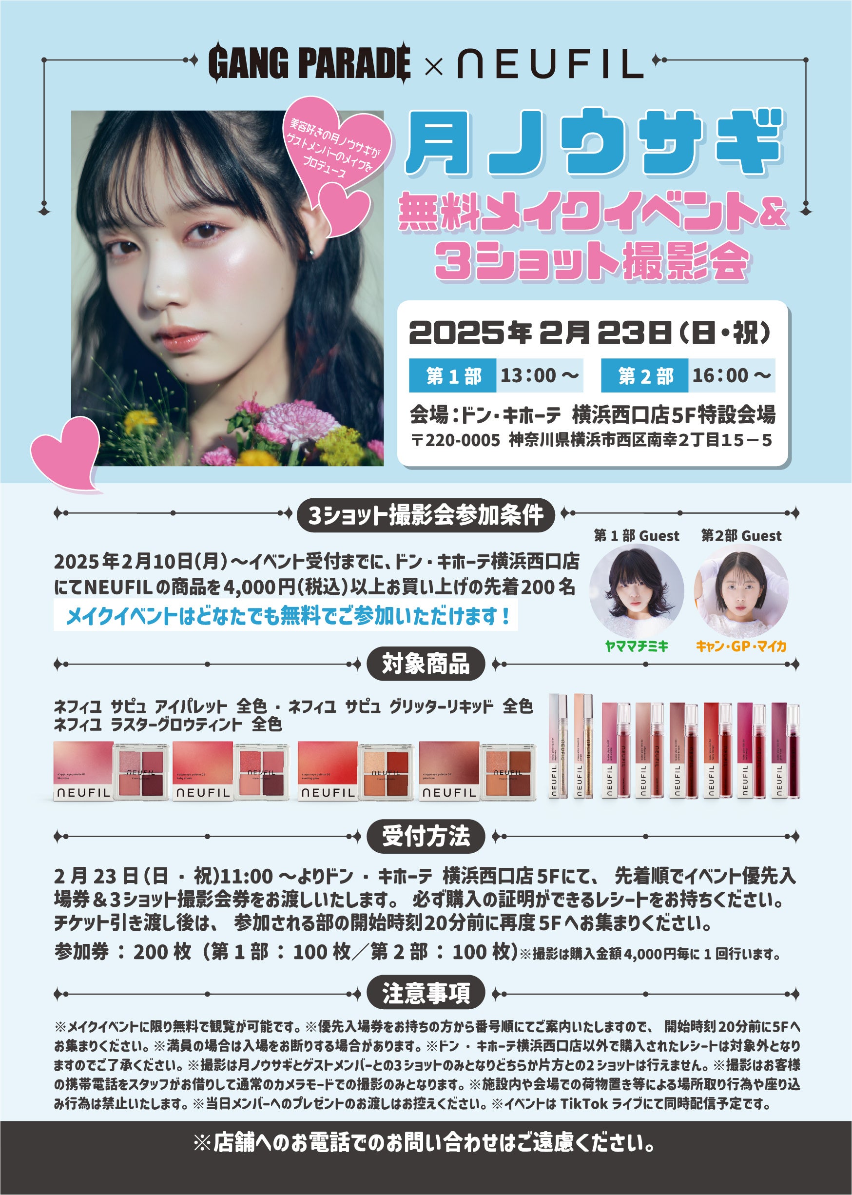 2025年2月23日(日・祝)にドン・キホーテ横浜西口店にて、人気アイドルグループGANG PARADE・月ノウサギによる無料メイクイベント&ゲストメンバーとの3ショット撮影会を開催!