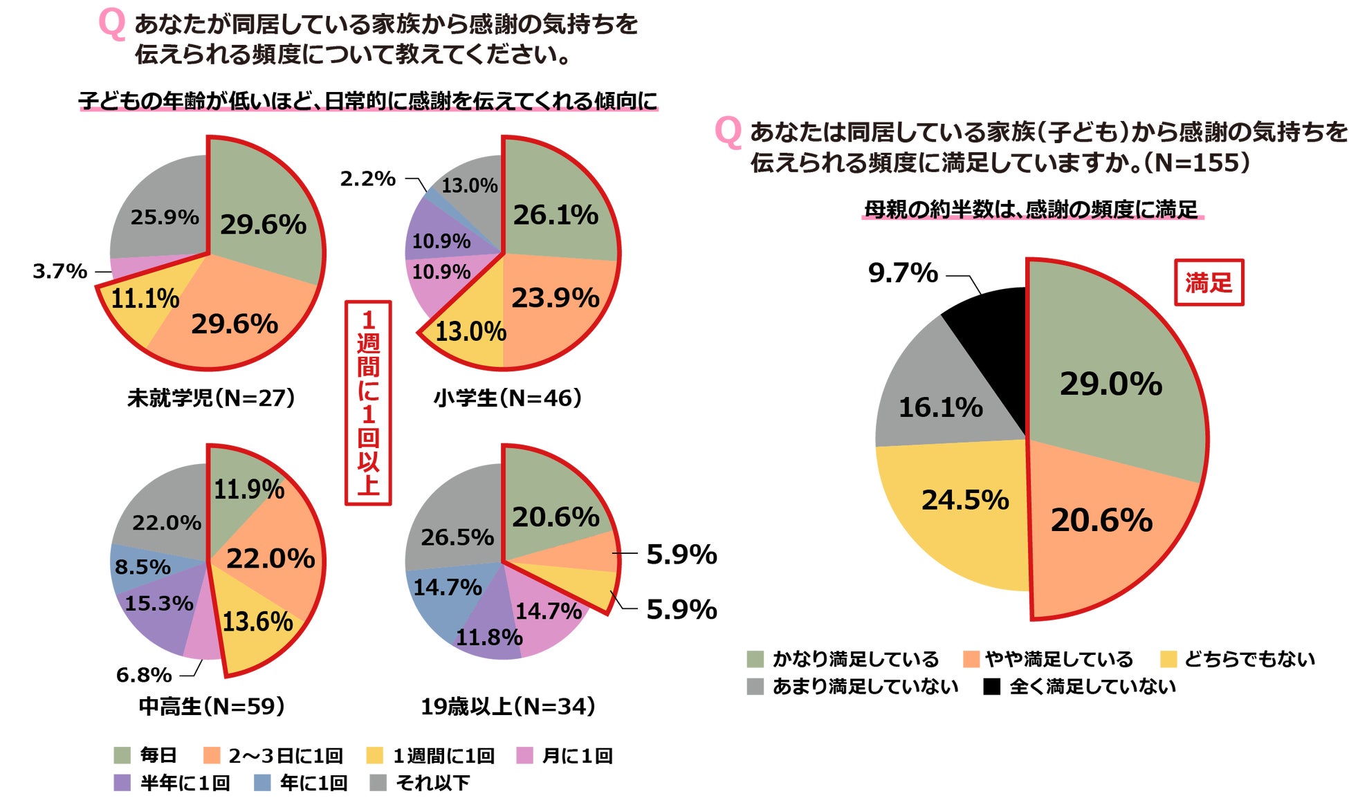 同居している子どもから感謝の気持ちを伝えられる頻度について、子どもの年代別で比較したところ、感謝の気持ちを伝えられる頻度が1週間に1回以上である人が占める割合は、「未就学児」が約7割(70.3%)、「小学生」が約6割(63.0%)、「中高生」が約5割(47.5%)、「19歳以上」が約3割(32.4%)と、年齢が低いほど日常的に感謝を伝えてくれる子どもが多いことがわかりました。また、感謝の気持ちを伝えられる頻度に満足しているか聞いたところ、母親の約半数(49.6%)は満足していると回答。一方で約4人に1人(25.8%)は感謝の頻度に満足していないことも明らかになりました。