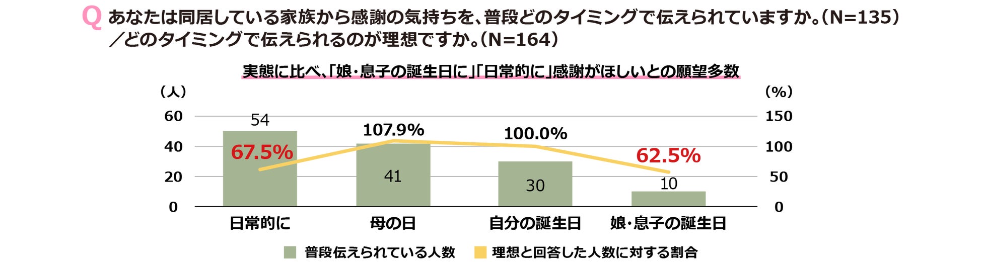 同居している家族から感謝の気持ちを伝えられるタイミングについて、実態と理想のタイミングを聞いたところ、「母の日」に感謝を伝えられている母親の数は、伝えられるのが理想と回答した母親の数以上である一方で、 「日常的に」あるいは「娘・息子の誕生日に」感謝を伝えられている母親の数は、理想に対してそれぞれ67.5%、62.5%と6割程度にとどまり、母親の希望とギャップがあることがわかりました。