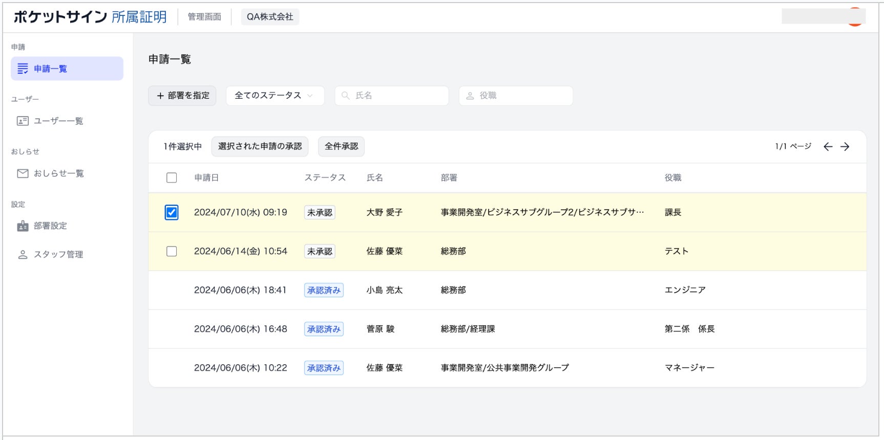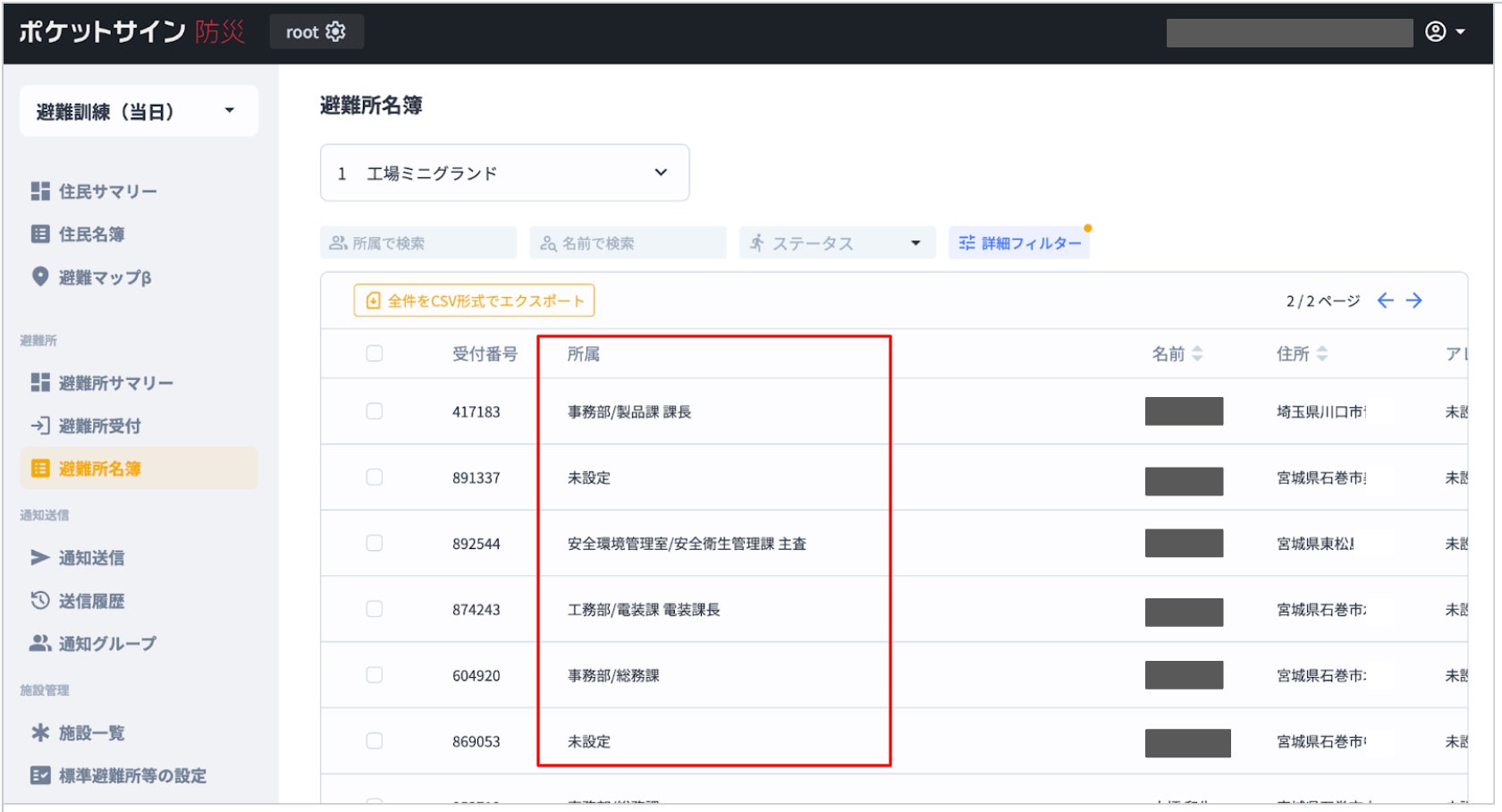 マイナンバーカードの登録情報(4情報)に加え、どこの部署でどんな役職であるかの情報を反映させるために、「ポケットサイン所属証明」をご利用いただきました。「ポケットサイン所属証明」に部署・役職を事前に登録しておくことで、ユーザーの所属を「ポケットサイン防災」の管理画面に表示させることができます。
