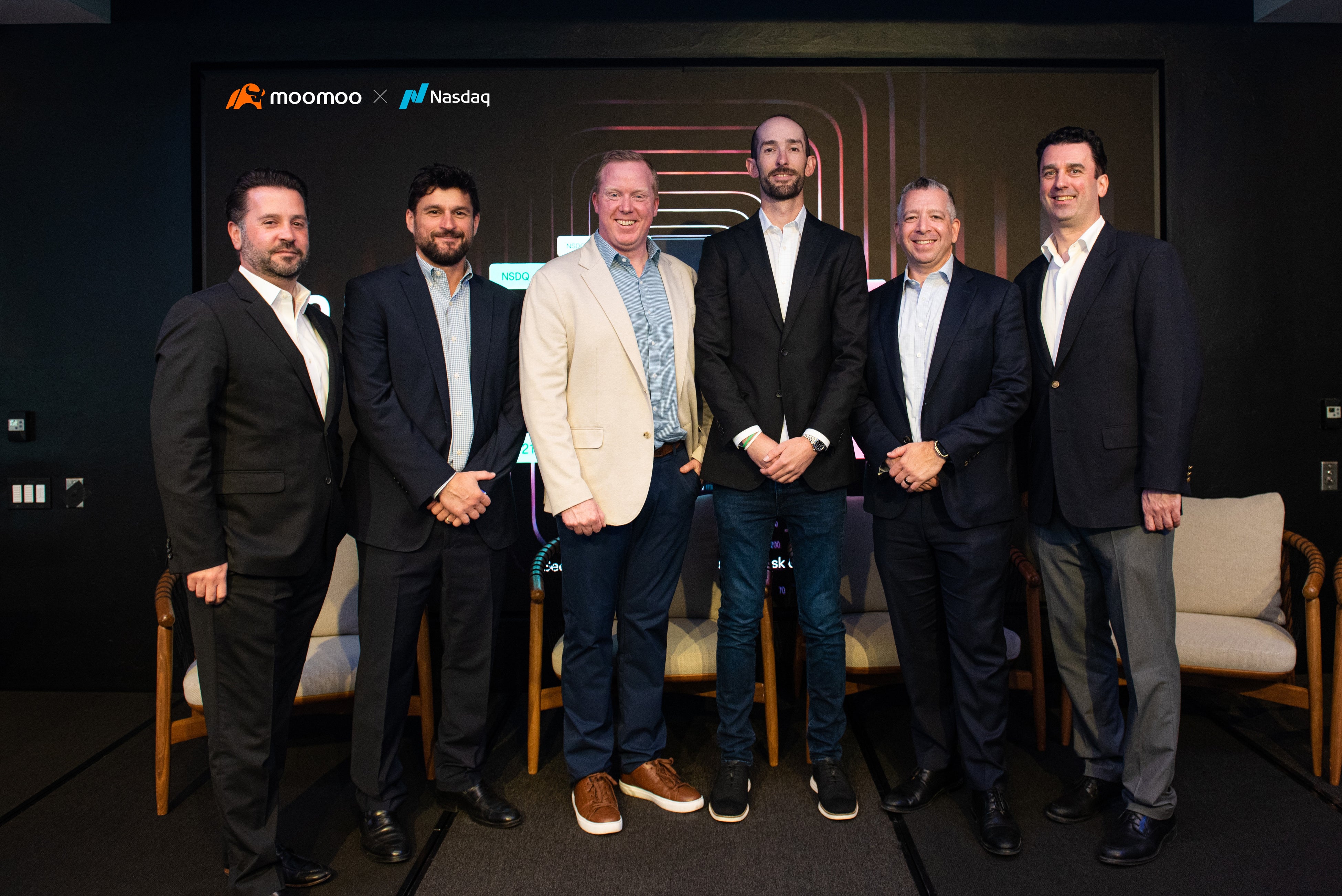 写真の左から:グレッグ・フェラーリ(ナスダック、北米マーケットサービス取引所管理担当バイスプレジデント)、ジョン・ブラック(ナスダック、インデックスオプション担当アソシエイトバイスプレジデント)、トーマス・マグワイア(ナスダック、データプロダクト管理担当アソシエイトバイスプレジデント)、ネイト・パルマー(Moomoo Financial Inc.プレジデント)、ブランドン・テッパー(ナスダック、データ担当シニアバイスプレジデント兼グローバルヘッド)、ジャスティン・ザックス(Moomoo Technologies Inc.戦略担当バイスプレジデント)。