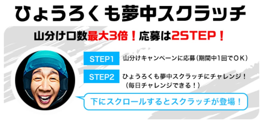 ・参加方法:実施期間中に「総額7,900万円分以上!競輪毎日山分けキャンペーン」ページ内に表示されるスクラッチで、3つのひょうろくさんのアイコンから1つタップして削っていただくことで参加となります(スクラッチは、1日1回限定です。スクラッチを複数回削った場合は、応募が無効となりますのでご注意ください)。