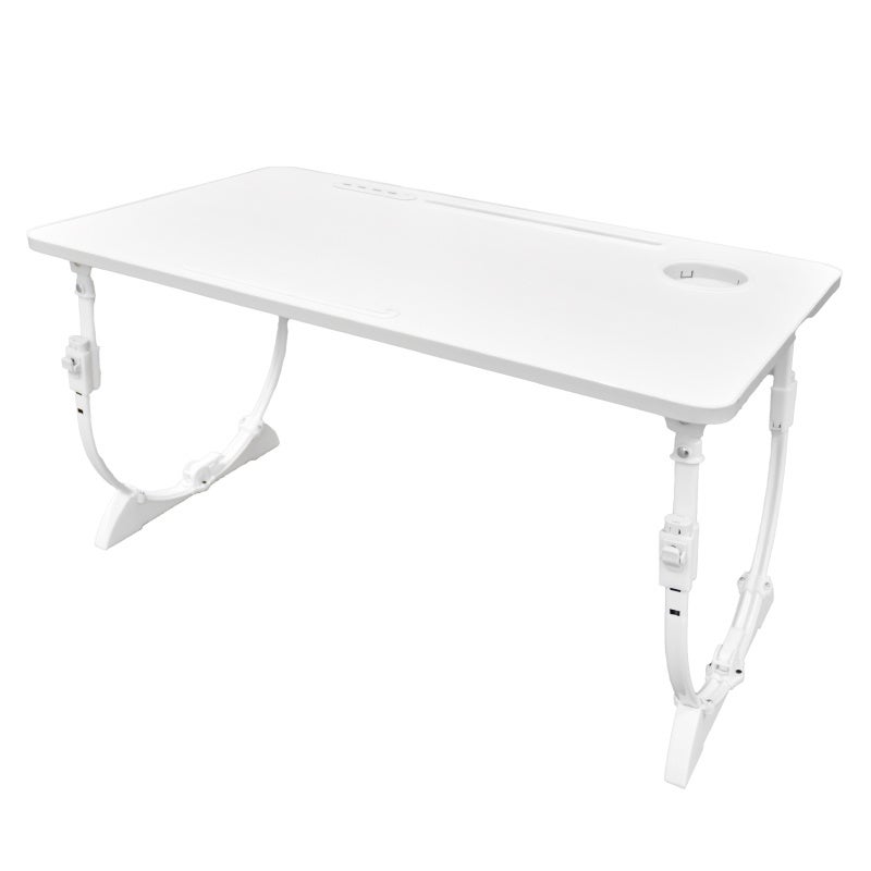 4個のUSBを搭載し、付属のUSBファンを使用したり、スマホの充電も可能。テーブル手前側にはプッシュ式で上げ下げできるのPCストッパー付き、角度を変えてもパソコンがずり落ちません。奥側にはタブレットが置ける溝。付属のブックスタンドで本も読めます。