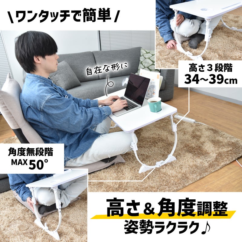 楽な高さで作業ができる角度も自在なUSB付幅70cmのワイドローテーブル