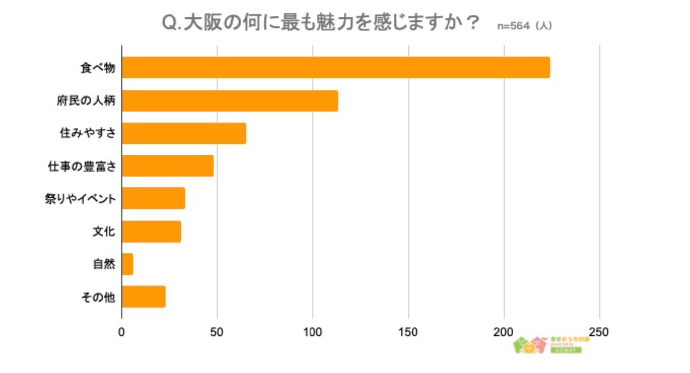続いて、「大阪の魅力」について聞いたところ、1位が「食べ物」で224人、2位が「府民の人柄」で113人、3位が「住みやすさ」で65人という結果になりました。食い倒れの街のイメージ通り、大阪の食文化に魅力を感じている人が多いとわかります。