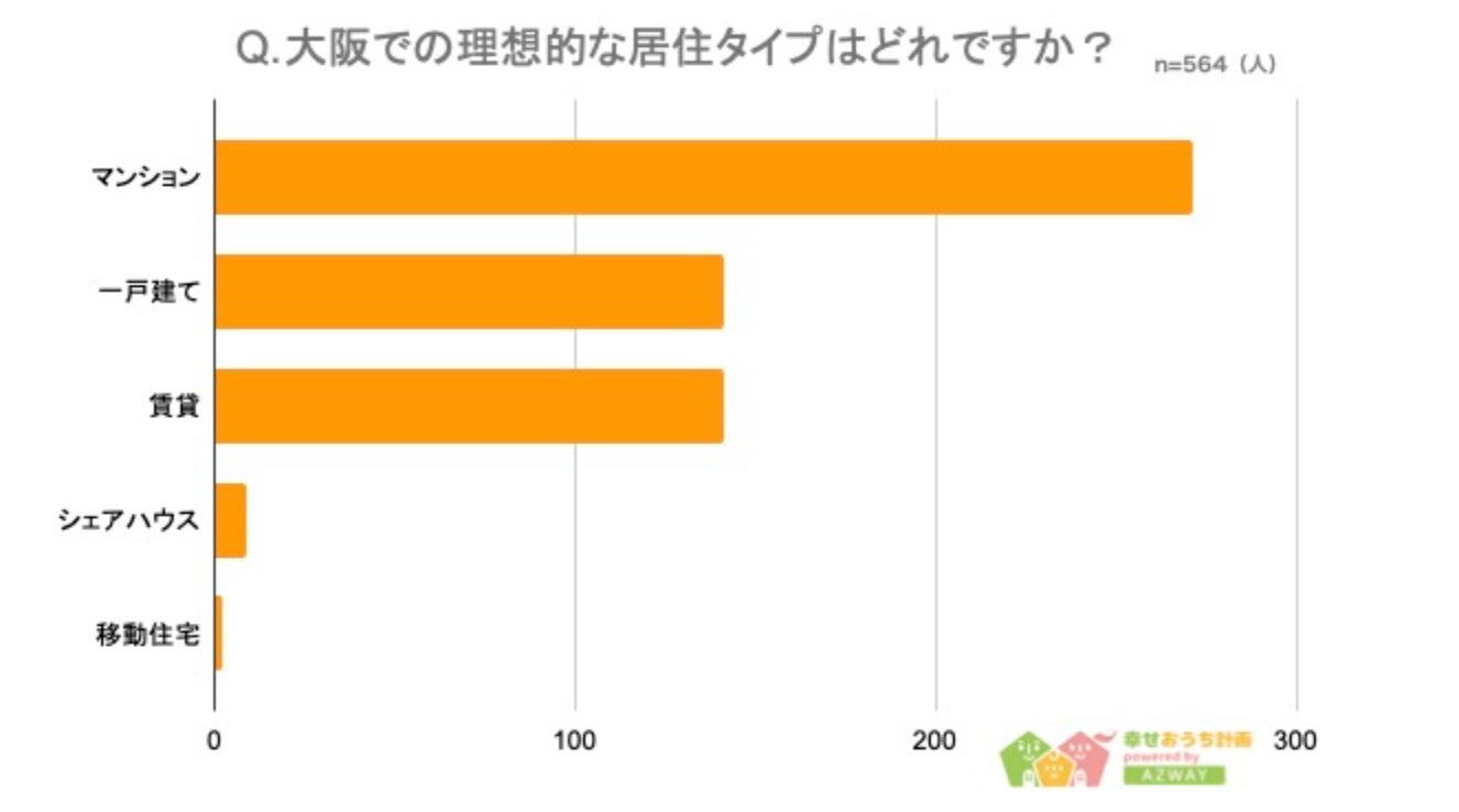 また、「大阪で生活する場合の住居」については、「マンション」が271人で1位という結果に。約半数の人が、マンションでの生活を望んでいることがわかります。一方、「一戸建て」や「賃貸」を選んだ人は141人で、マンションの約半数という結果に。戸建住宅はマンションよりも比較的高いため、価格がネックになっていることが窺えます。