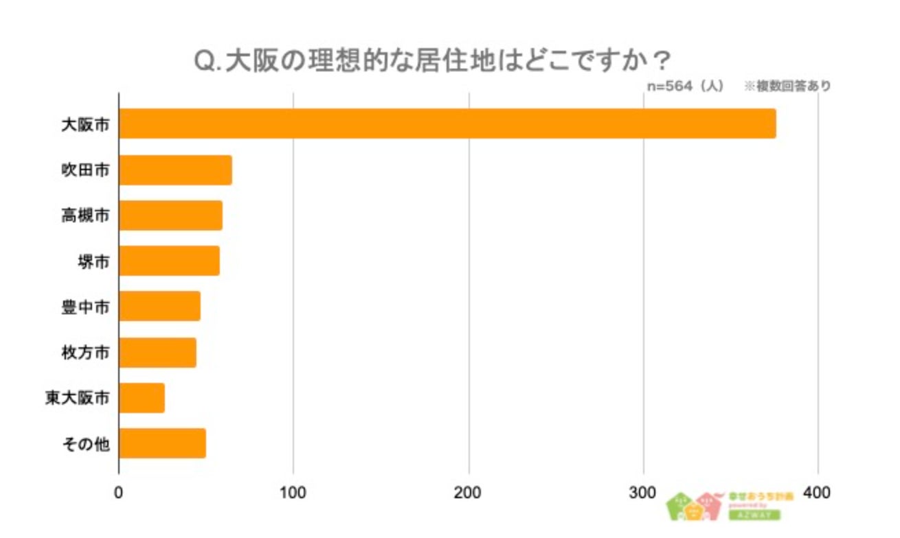 また、大阪の理想的な居住地としては「大阪市」が376人で6割以上の支持を集めるという結果に。大阪市には「あべのハルカス美術館」や「大阪中之島美術館」などの文化施設はもちろん、大型ショッピングモールやカフェなども揃っており、外出が好きな人にとって非常に楽しめる場所だと言えます。