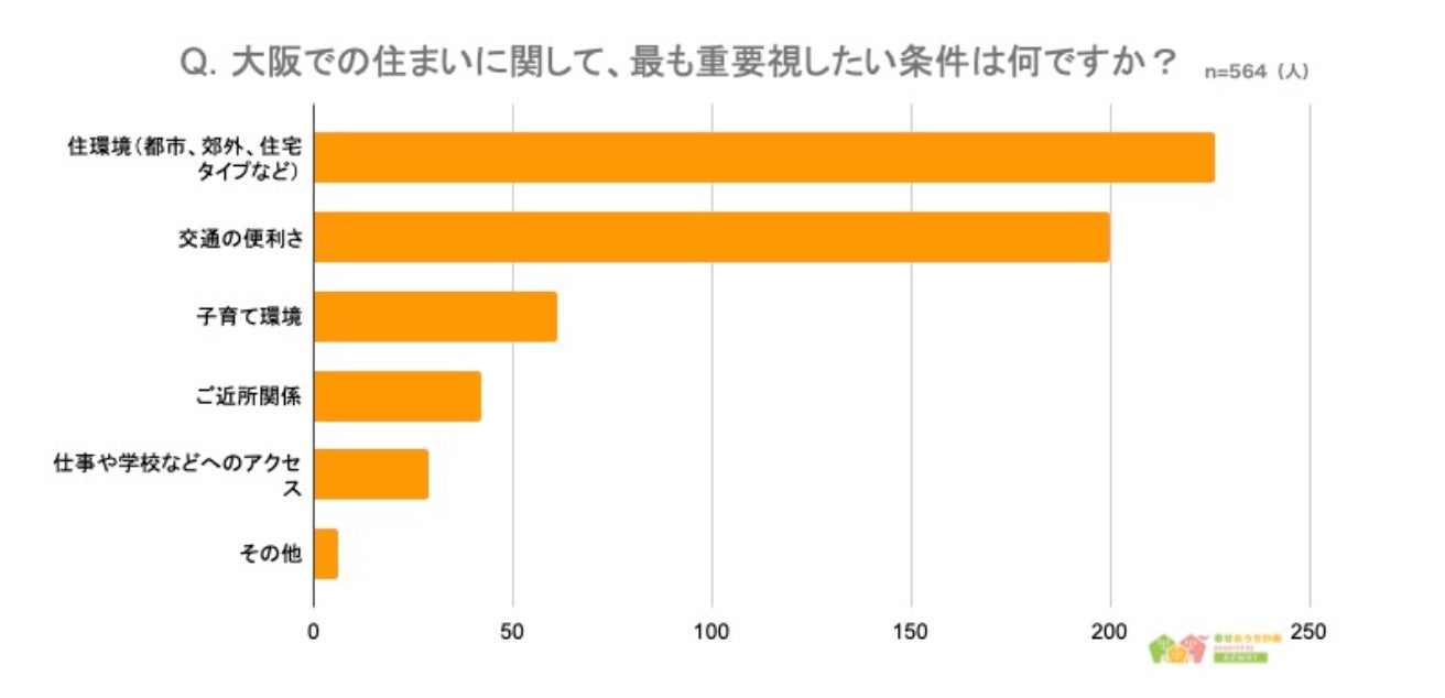 最後に、「大阪に住んだ場合、住まいで重視する条件」を聞いたところ、「住環境」が1位で226人、「交通の便利さ」が2位で200人、「子育て環境」が3位で61人という結果になりました。多くの人が、住環境や大阪の交通の便利さを重視していることがわかります。
