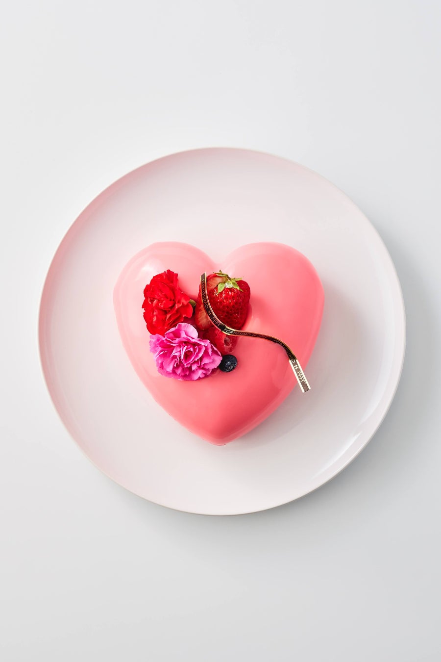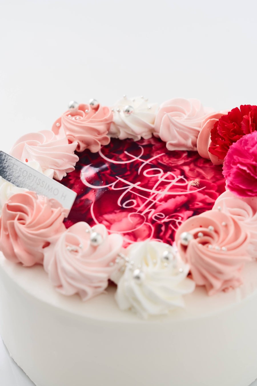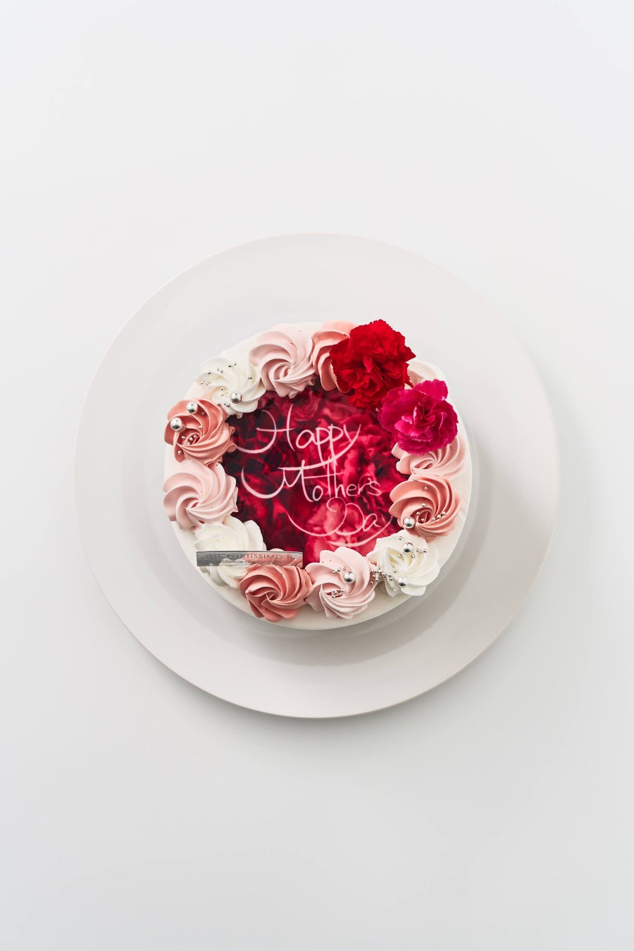苺のセゾンドガトーを母の日らしくドレスアップ!カーネーションをプリントしたチョコレートパーツとフェミニンなデコレーション。花束のような可憐なケーキに日頃の感謝の気持ちを込めて。