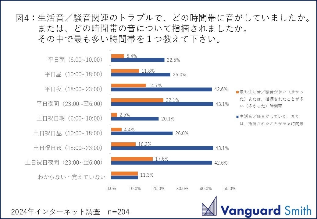 生活音/騒音関連のトラブル継続期間について聞くと、1年以上続いたという結果が半数(50.5%)を占めました(図3)。音の発生時間帯を問う設問には、【平日夜間(23:00~翌6:00)】(43.1%)と【土日祝日夜(18:00~23:00)】(43.1%)が最も高く、次いで【平日夜(18:00~23:00)】(42.6%)と【土日祝日夜間(23:00~翌6:00)】(42.6%)という結果になりました(図4)。生活音/騒音を最も感じる季節があるかの問いには【季節による違いはない】との回答が8割(80.9%)にも及びました(図5)。