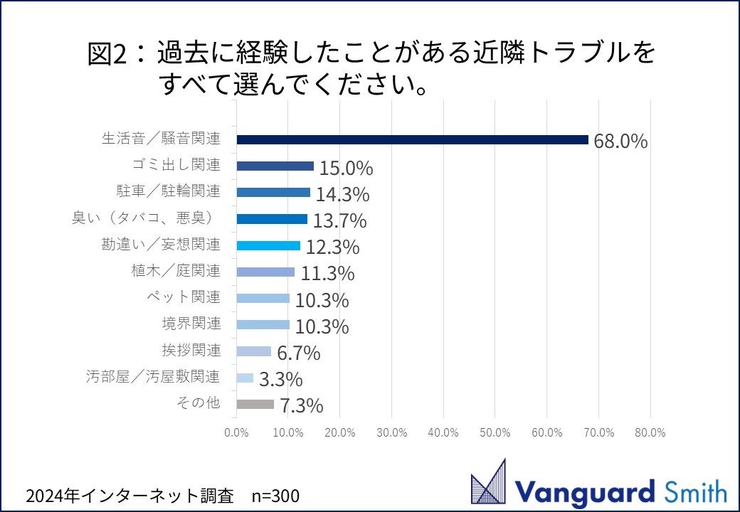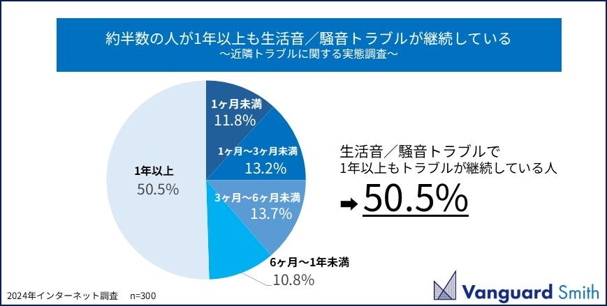 元警察官による、近隣トラブル解決支援サービスを主要事業として展開する株式会社ヴァンガードスミス (本社:東京都港区、代表取締役:田中慶太、以下「当社」)は、近隣トラブルの経験者を対象に、近隣トラブルに関するアンケート調査を実施いたしました。アンケート調査は定期的に行っており、前回2023年7月以来1年ぶりに実施いたしました。今回の調査の結果、近隣トラブルは生活音/騒音関連が圧倒的に高く、その半数は1年以上もトラブルが継続していることが分かりました。