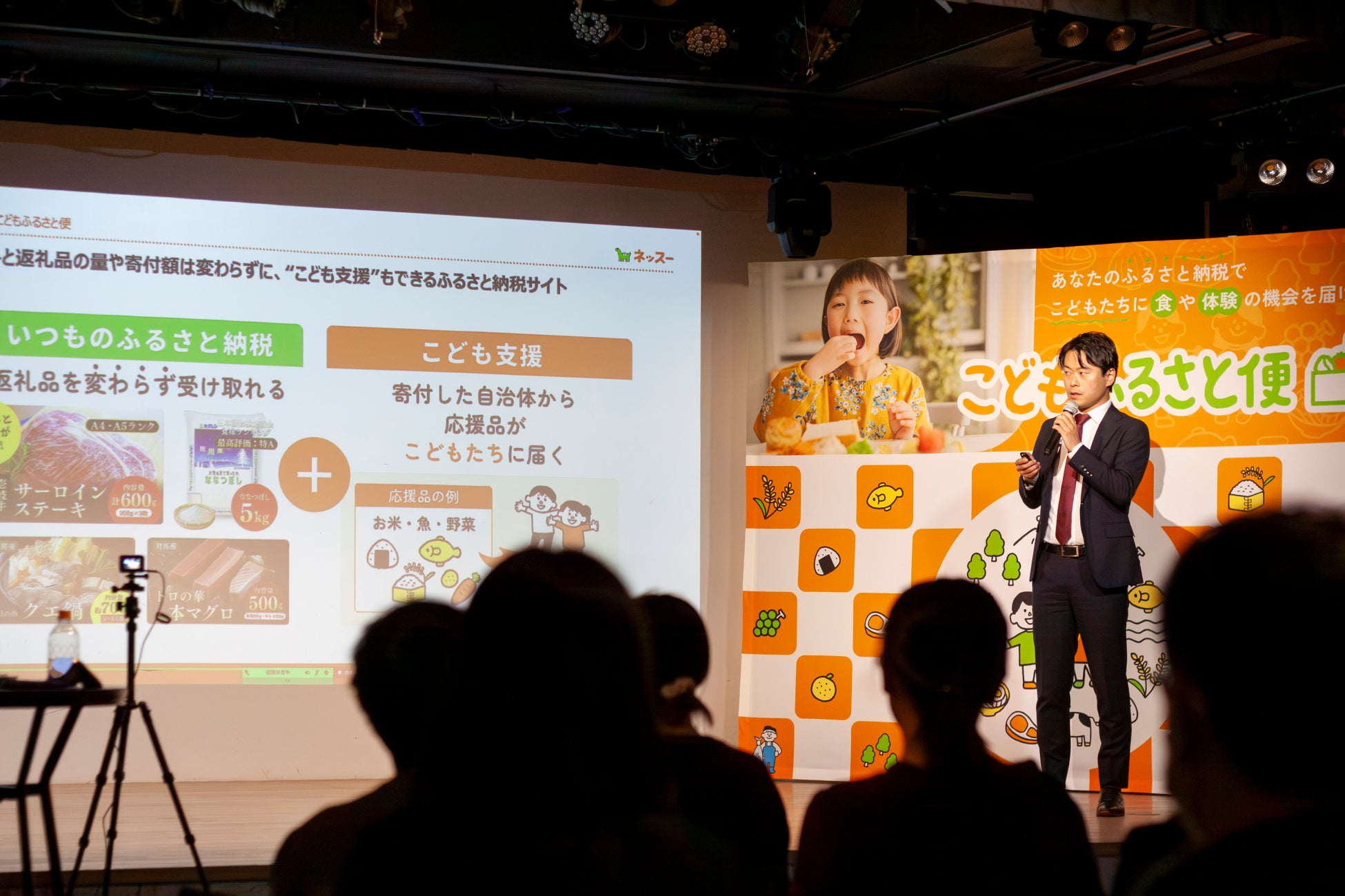 発表会の冒頭では、ネッスー代表取締役・木戸優起が登壇し、「こどもふるさと便」の事業が誕生した背景や、これまでの実績、そして取り組みに込めた想いを語りました。