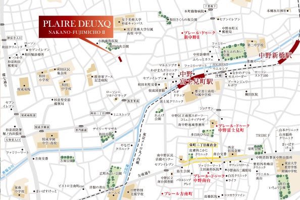 「プレール・ドゥーク 中野富士見町Ⅱ」は、北側の中野エリア、東側の新宿エリアと、都内でも有数の再開発が進むエリアに囲まれています。