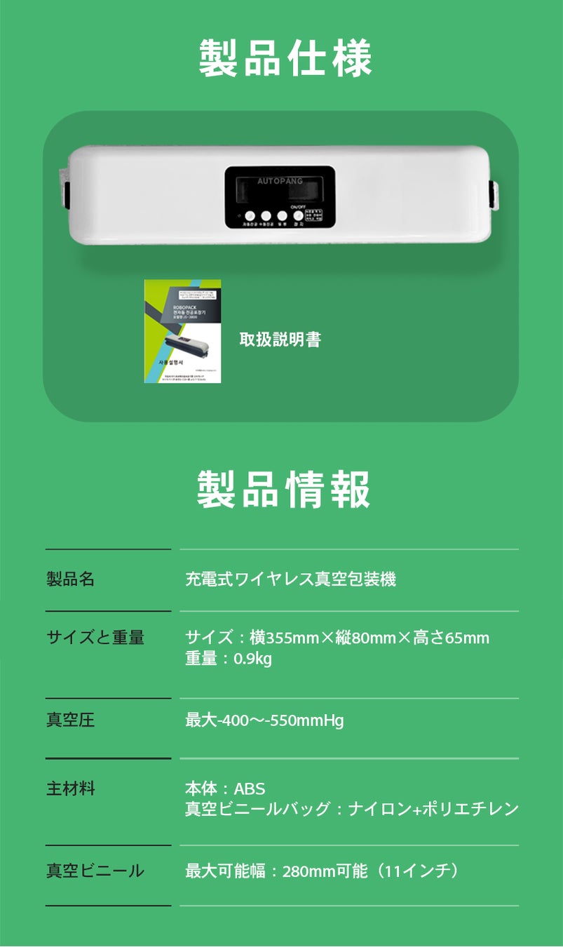 吸引からシーリングまで全自動!水気で破損しにくい構造の充電式食品用真空パック機