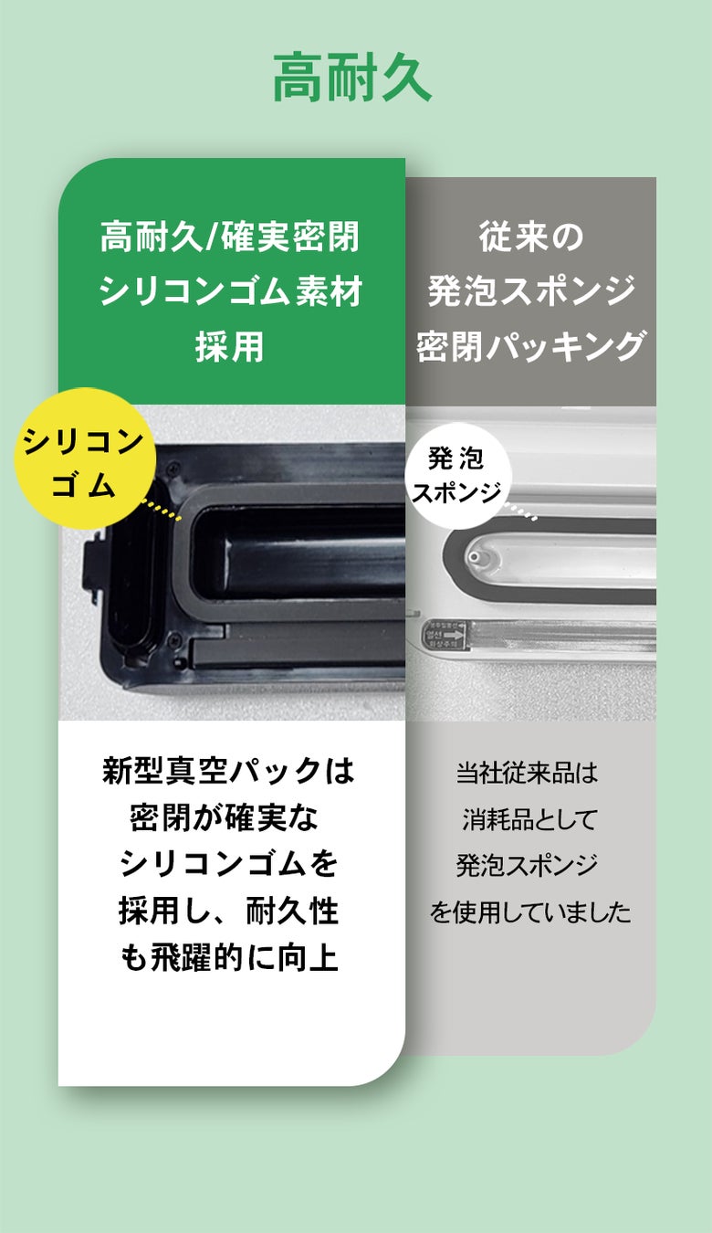 コンパクトでも十分な吸引能力があり、従来品は水分を吸い込むことで故障が発生しやすかったが、ポンプや電気回路をすべて上蓋に収納するなど耐久性も考えた全自動式真空パック機です。